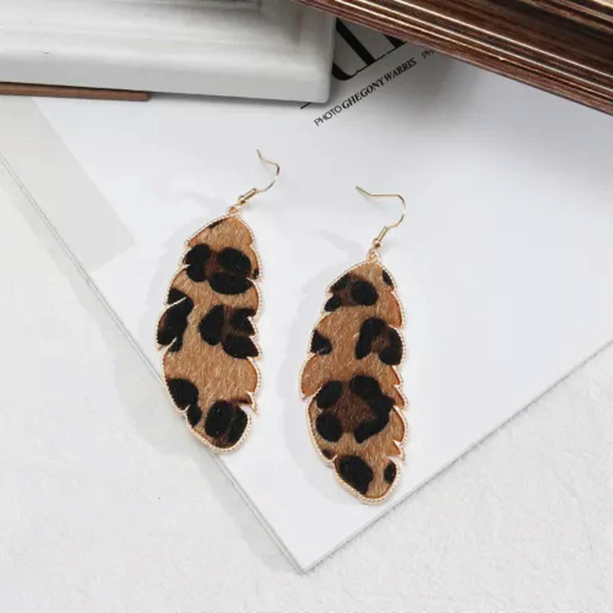 RSAMD Moroccan Snakeskin Leopard Leather Leaf Statement Earrings Gold Feather Jewelry-Leopard
