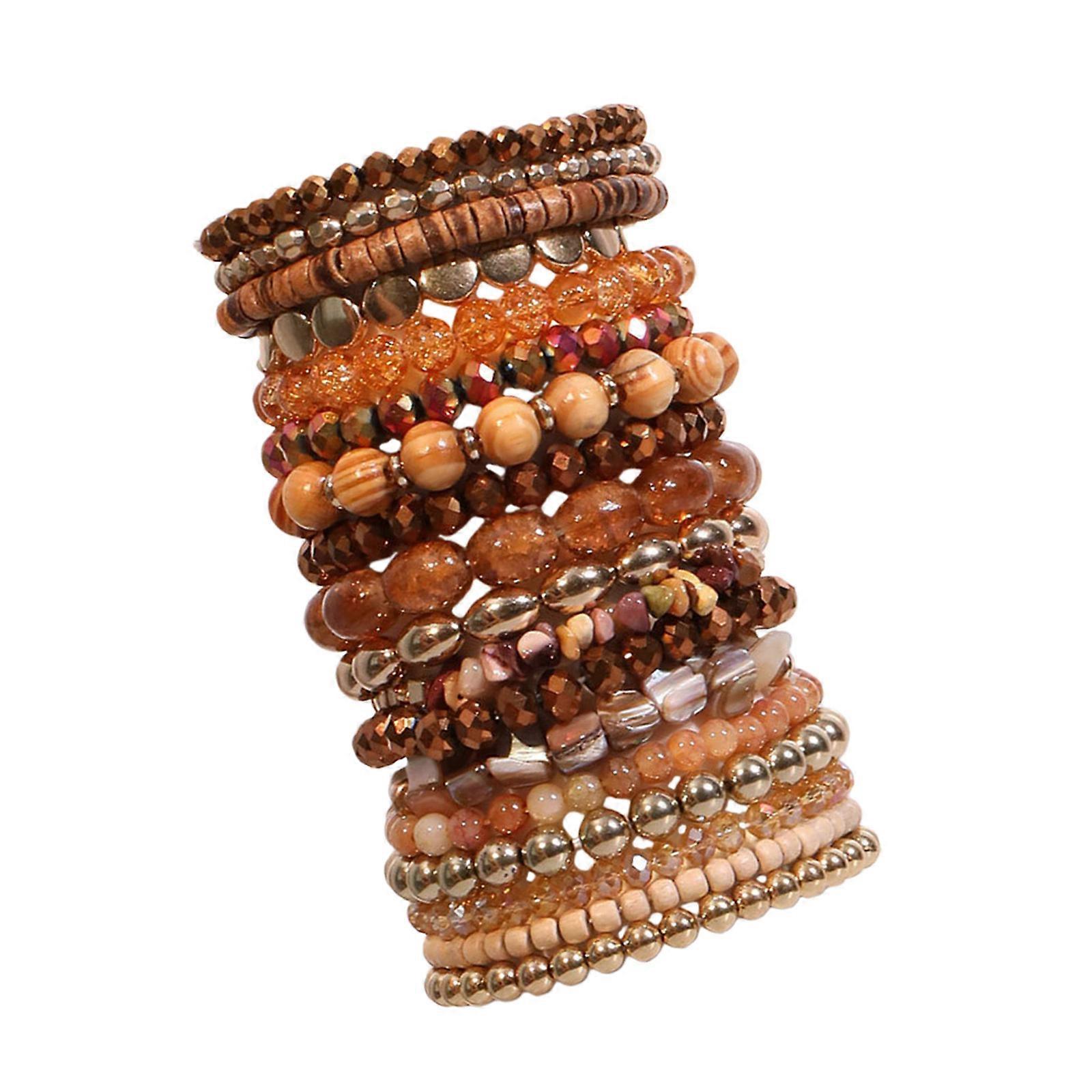 Elastic Bohemian Bead Bracelets Set of 12/18 Stackable Designs for Women Featuring Brown and Gold Accent Gift Ready Multicolor