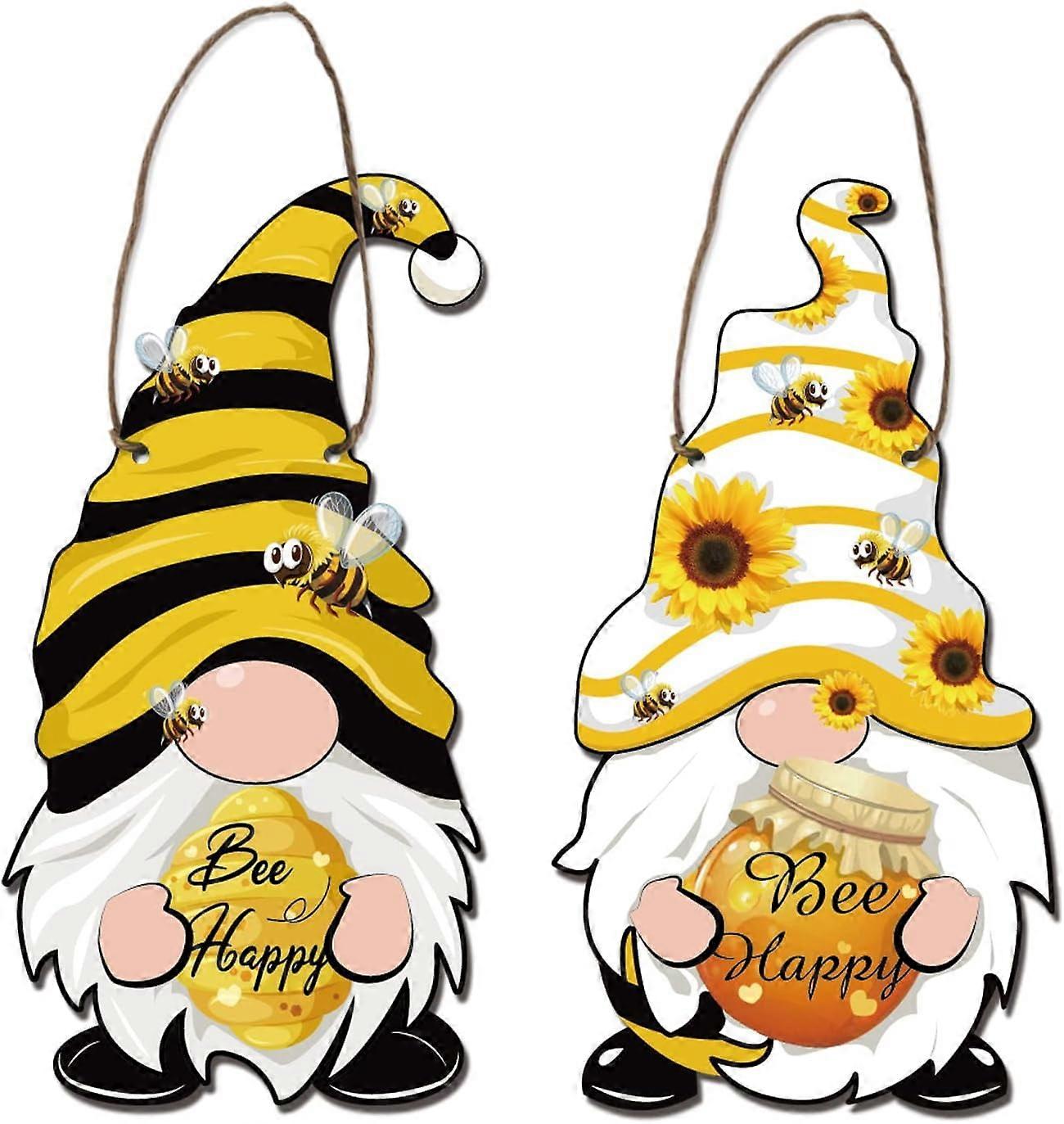 2 Pcs Bee Gnome Wooden Sign, Bee Happy Home Hanging Decor, Bumble Bee Door Sign, Farmhouse Wall Plaque with Jute Twine, 5.6"x11.8"