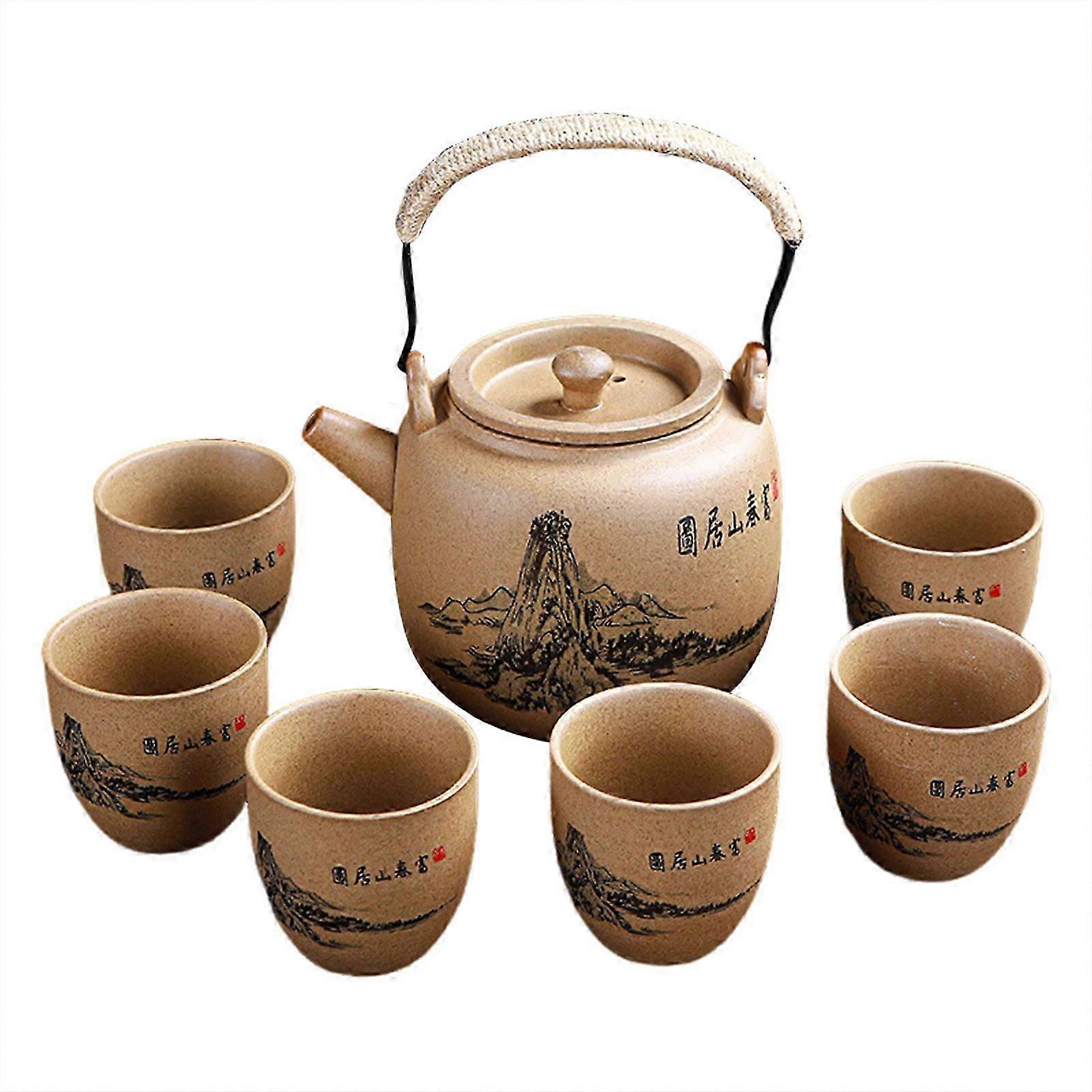 Handmade Vintage Ceramic Complete Tea Set with Pot and 6 Cups for Rustic Home Decor