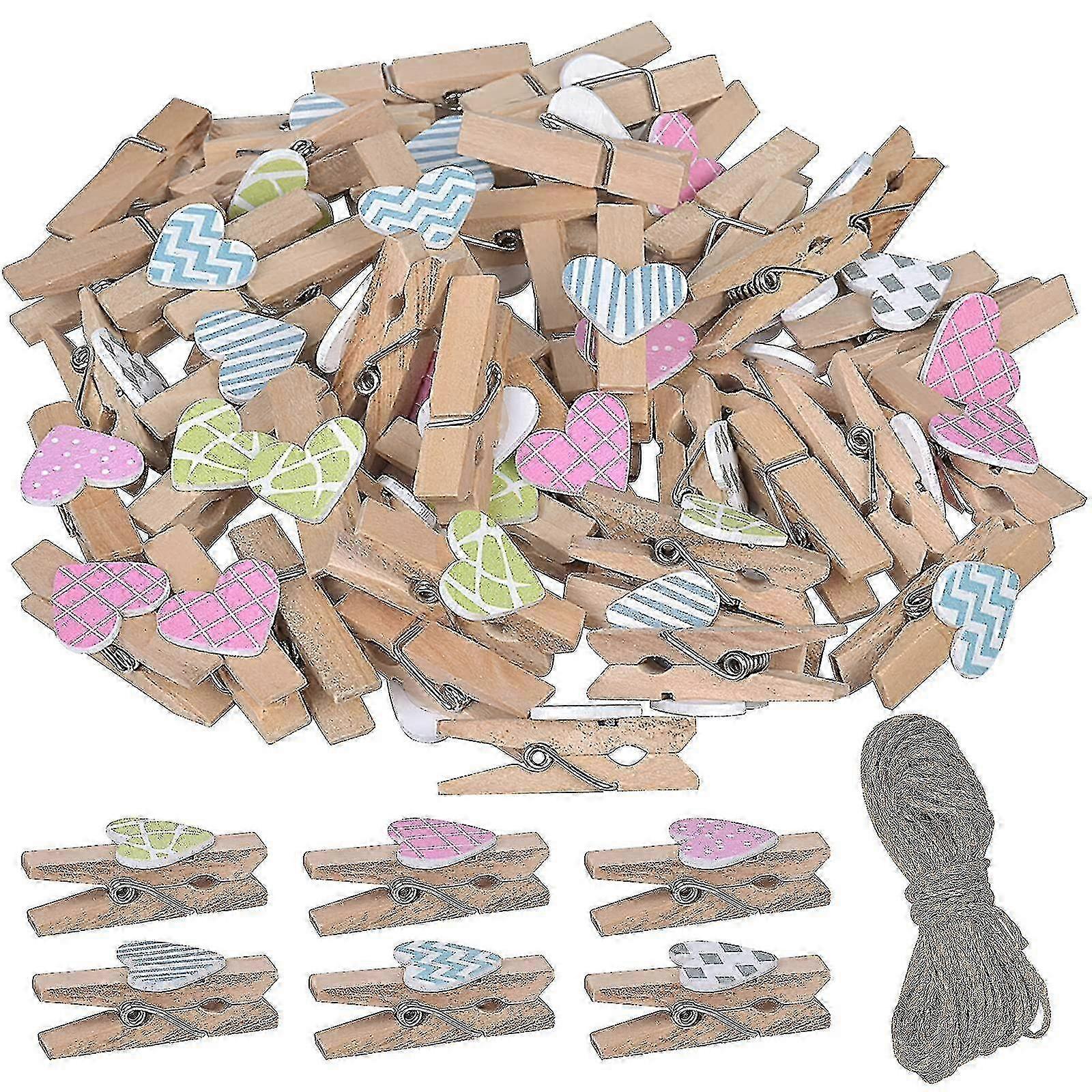 50 wooden photo clips, mini heart-shaped photo hanging display rope and clip set, six styles of photo decorative clips