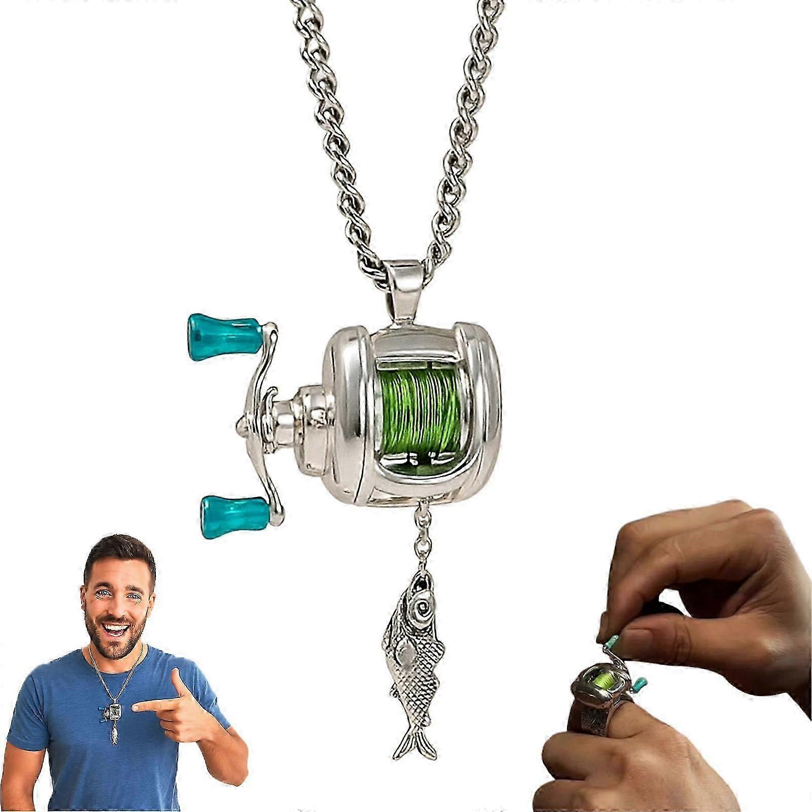 Mens Fishing Reel Necklace with Rotating Handle & Moving Line Guide, Fishing Reel Jewelry Gift for Men Anglers\u200b