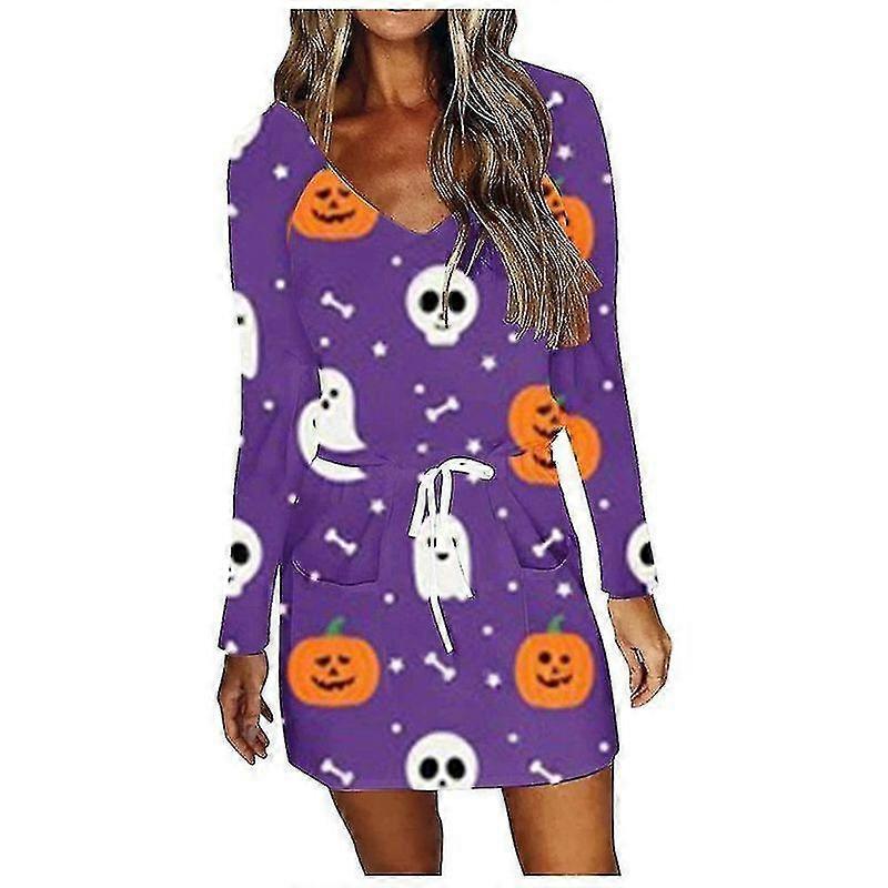 Luxora Women's Halloween Print V Neck Long Sleeve T-Shirt Dress Mini Dress