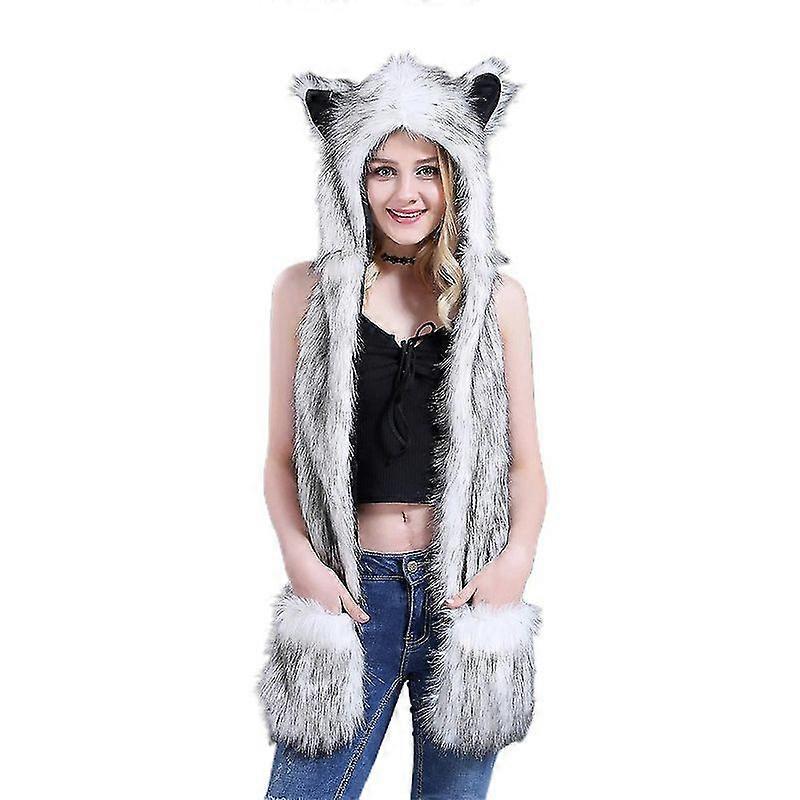 Luxora Women Winter 3 In 1 Faux Fur Animal Hood Hat Scarf Gloves Fluffy Snood Warm Soft Pockets Gift