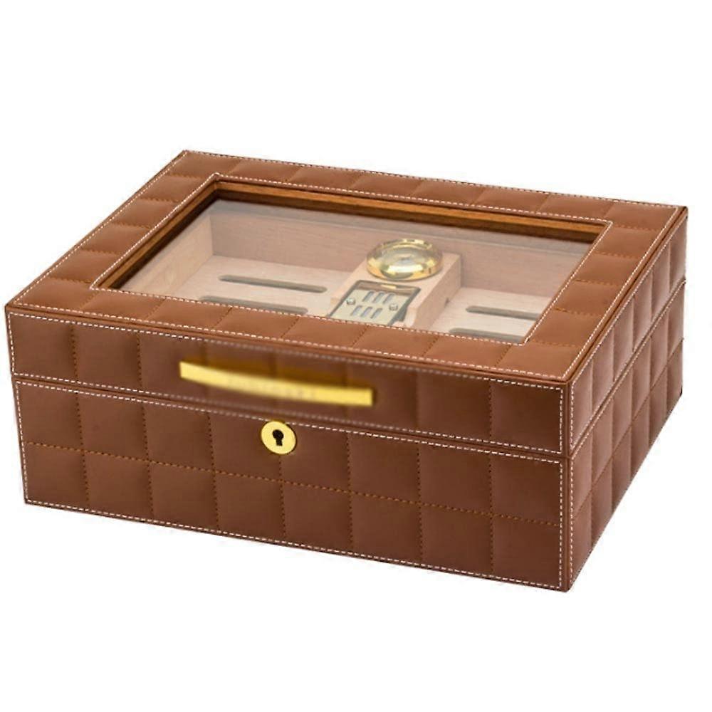 Glass Top Leather Cigar Display Box with Spanish Cedar Lining Large Capacity Humidor with Hygrometer and Humidifier Marrone