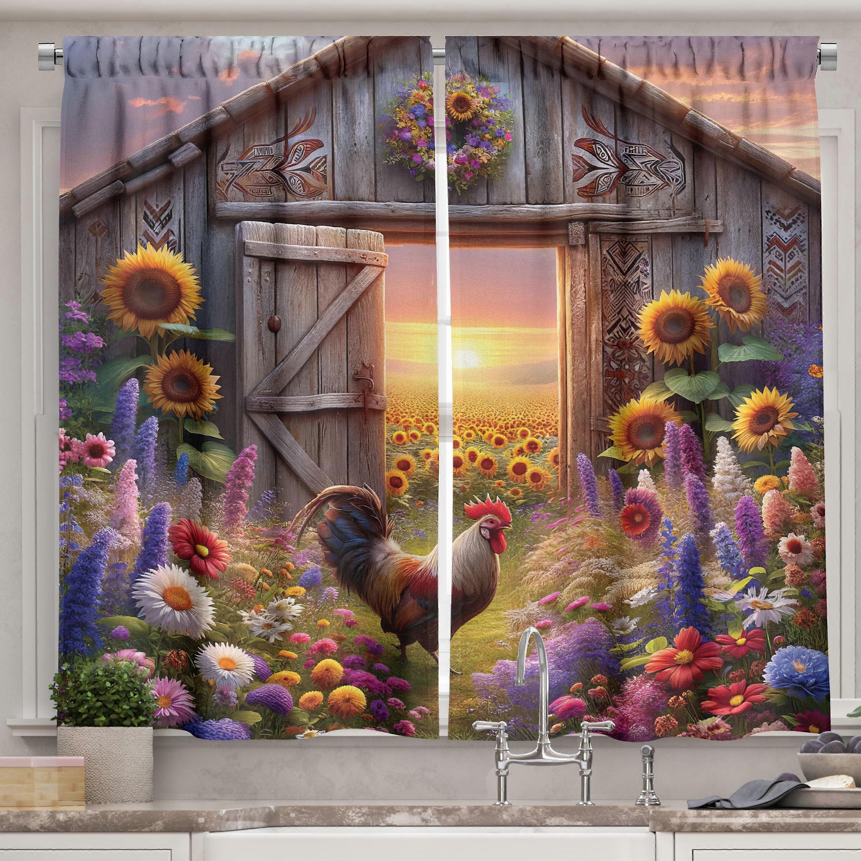 Ambesonne Rustic Kitchen Curtains, Colorful Flowers and Rooster, 55"x45", Mauve Taupe and Multicolor