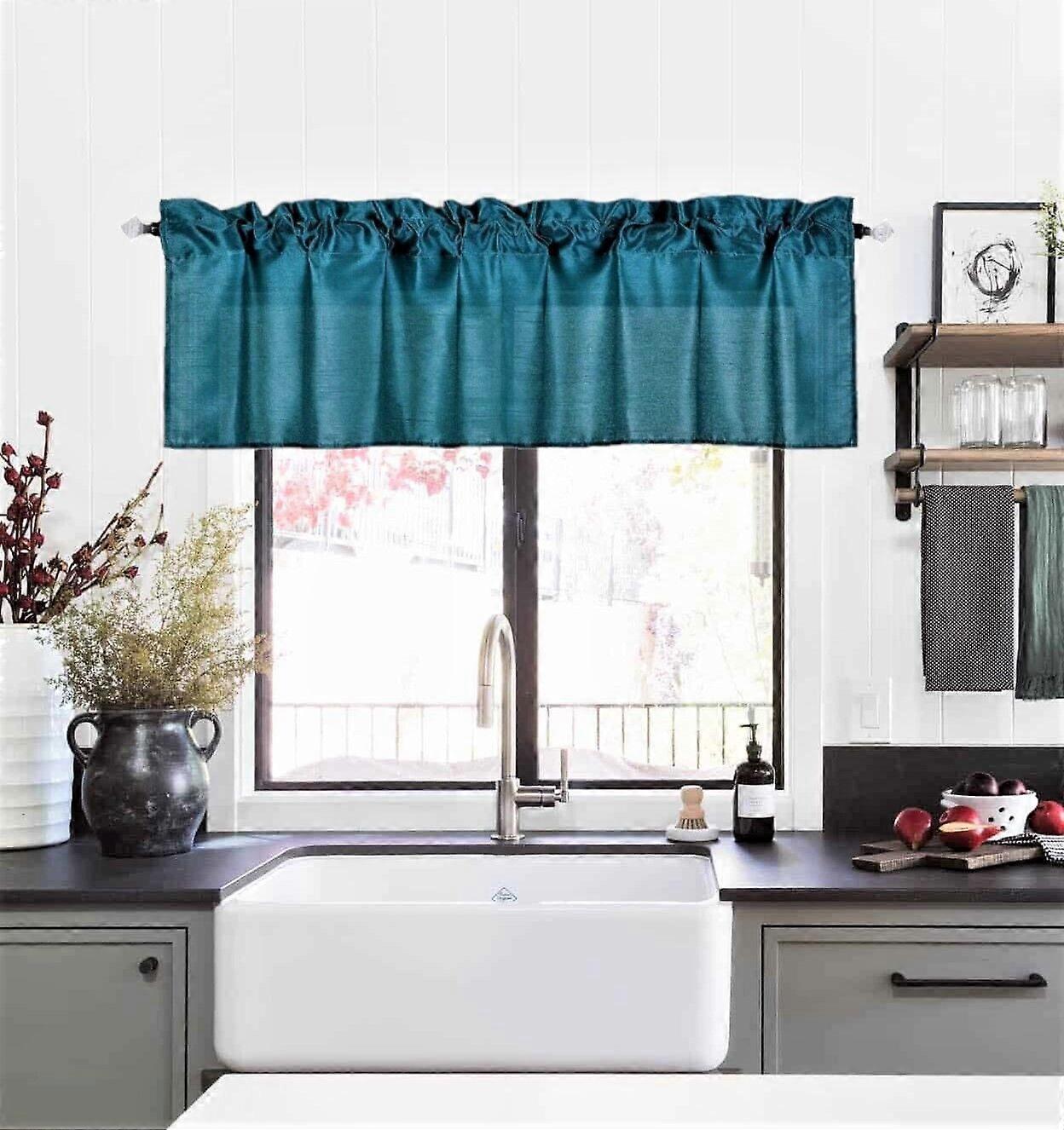 1 piece S18 luxury straight sheer faux silk window curtain valance for kitchen bathroom décor with rod pocket dark teal color 55" wide X 18" long