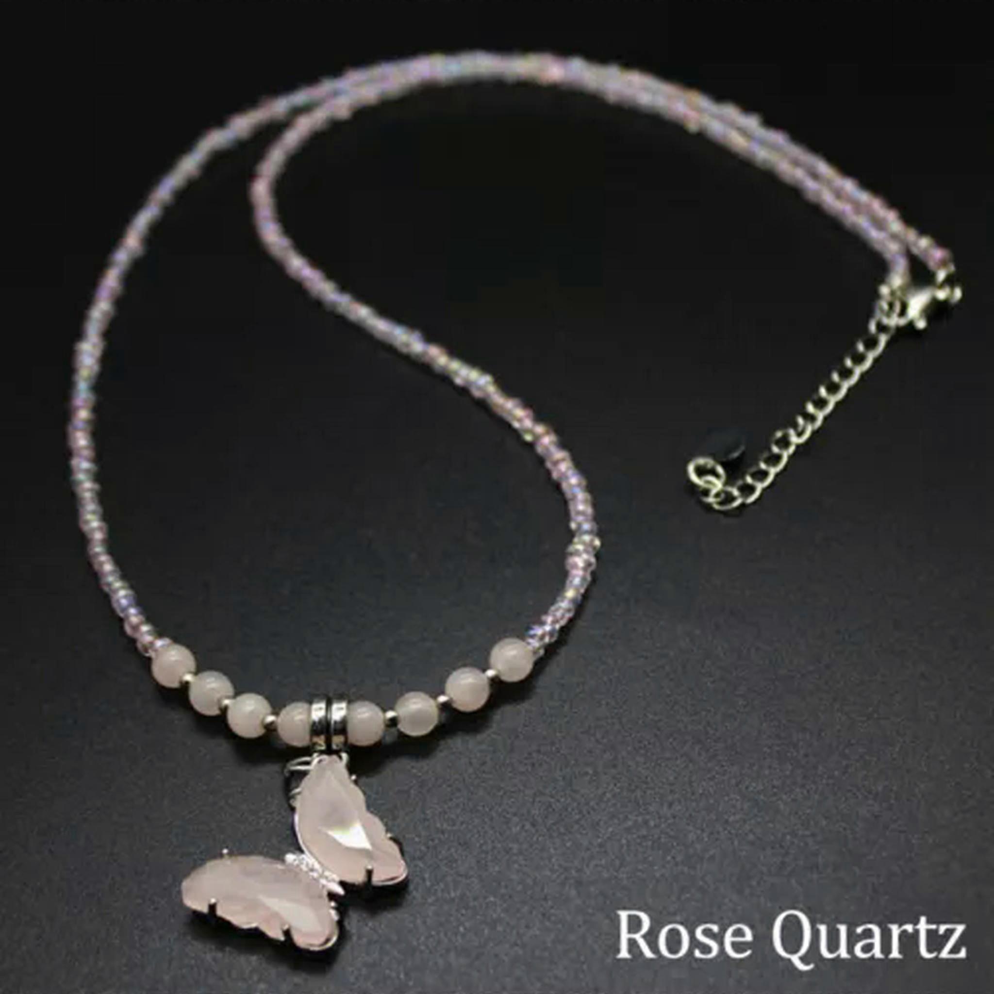RSAMD Chakra Crystal Beads Butterfly Pendant Necklace Natural Quartz Chain Reiki Gifts-Rose Quartz-1PC (Random Pick)