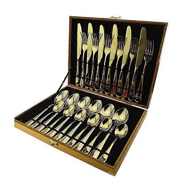 24-piece Stainless Steel Cutlery Set with Spoon, Fork, Knife, Wooden Box, Western Tableware (Gold) 34.5x25x4.5cm 34.5x25x4.5cm