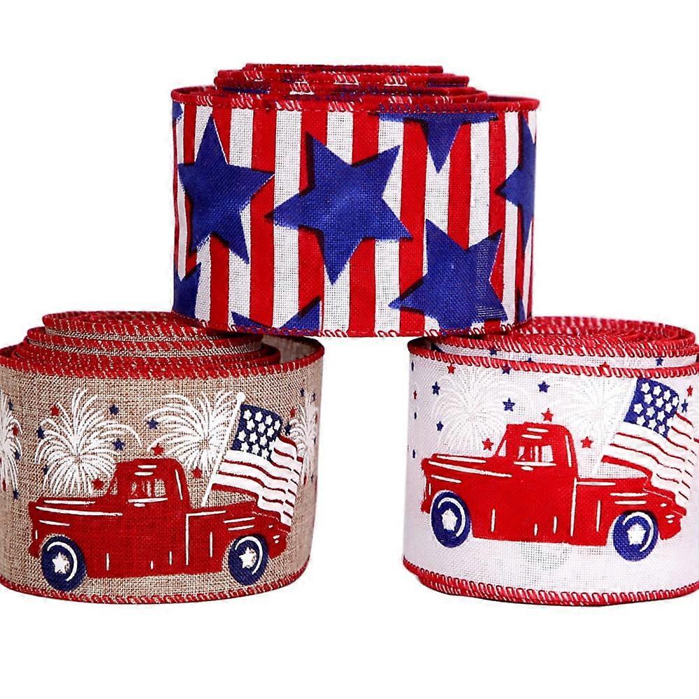 3 Rolls 4th of July Ribbon Red White Blue Patriotic Wired with Flags for Crafts, Decorations, Wreaths, Garland