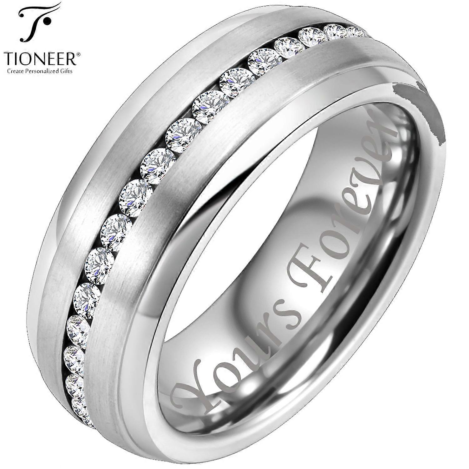 Tioneer Tungsten Carbide Wedding Band White CZ Eternity Style / Step Edges Silver or Black Ring 8mm