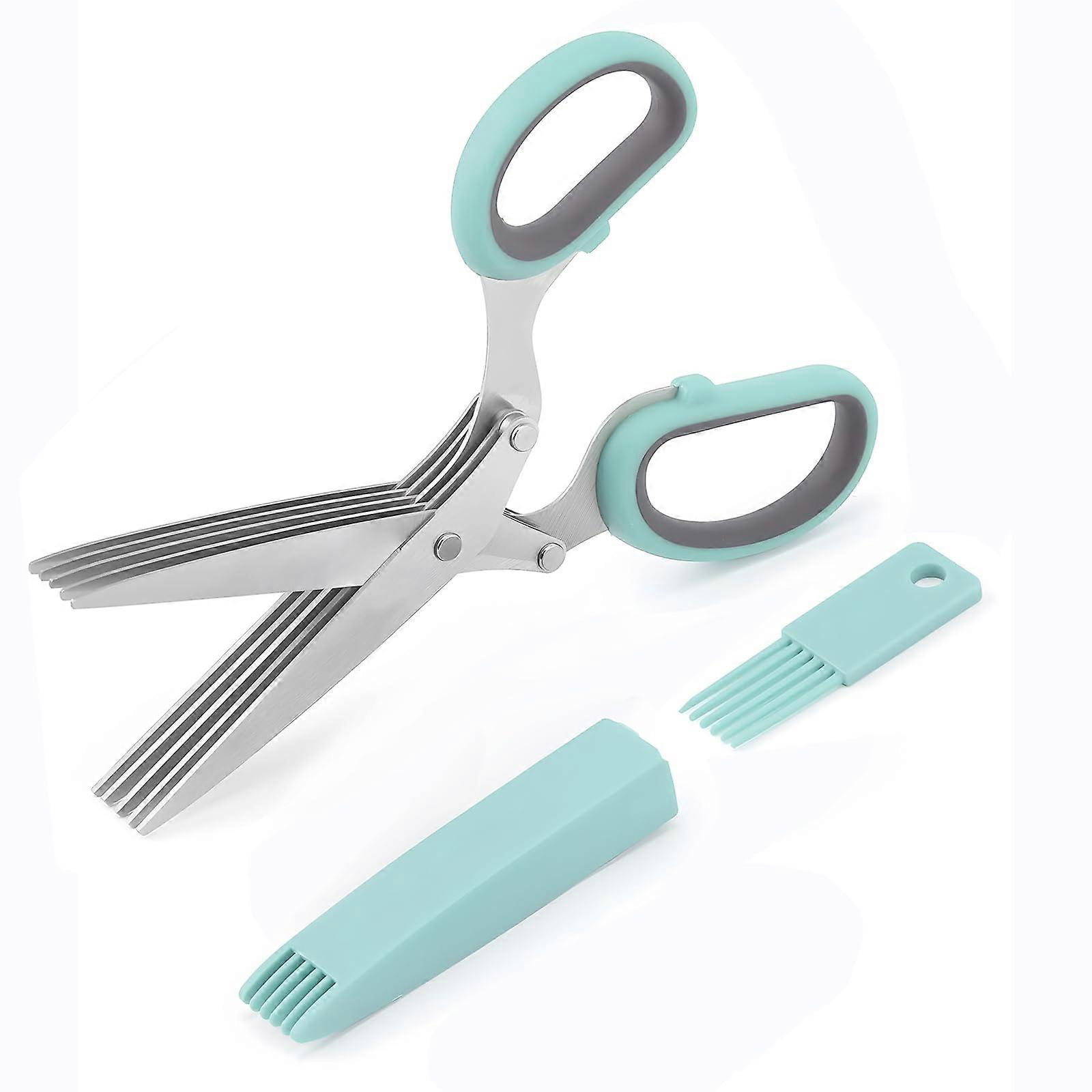 5Blade Stainless Steel Herb Scissors Kitchen Shears with Safety Cover and Cleaning Comb, Blue