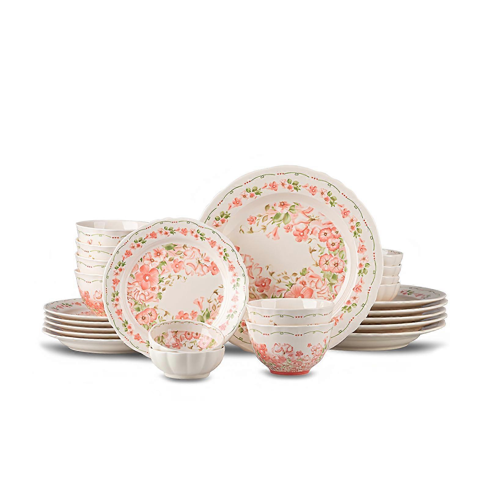24 Piece Ceramic Dinnerware Set for 6 with Pink Peach Blossom Design, Microwave Dishwasher Safe