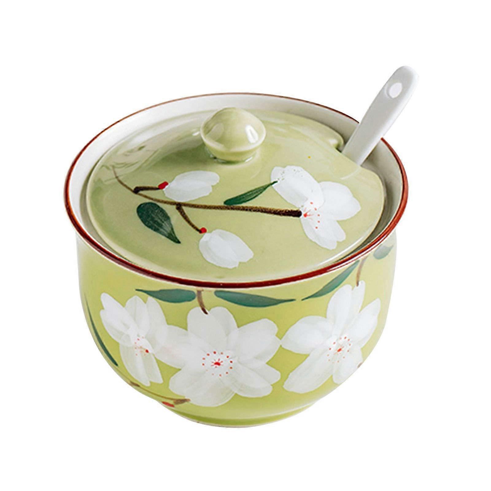 Hand Painted Ceramic Sugar Bowl with Lid and Spoon, Japanese Sakura Storage Jar 300ml Green