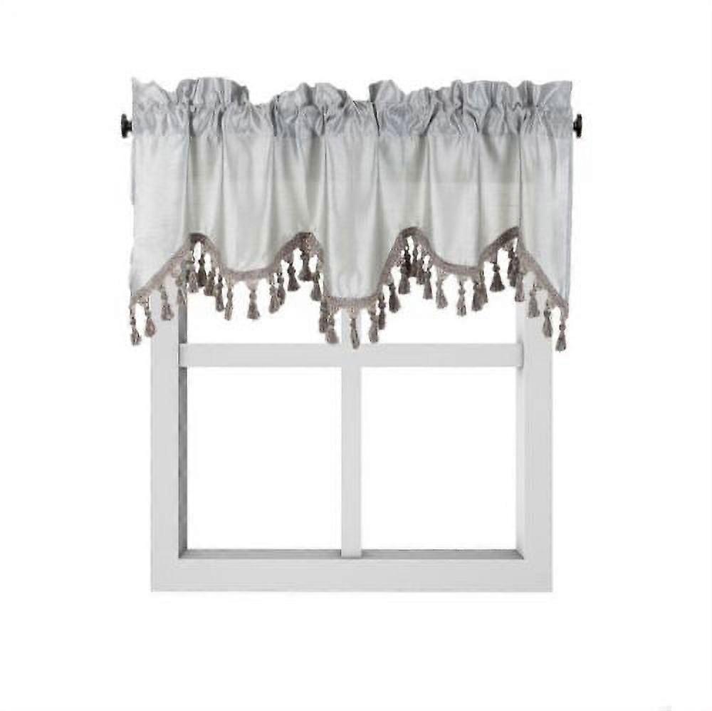 1 Pc Wave Valance w/ Bead Trim Tassels, SILVER, 52" x 18", Semi-Sheer, Rod Pocket, for Kitchen, Living Room