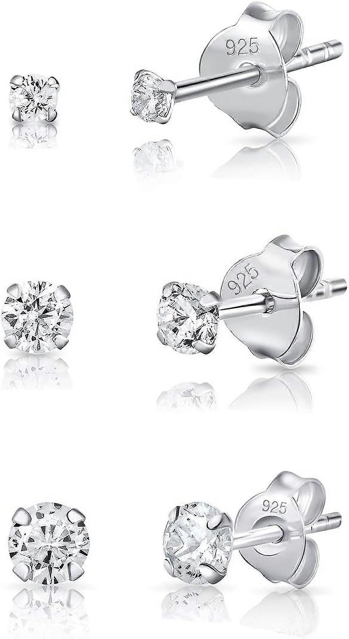 Set of 3 Pairs 925 Sterling Silver CZ Stud Earrings - Tiny Round - Perfect Jewelry Gift Compatible with Everyday Wear