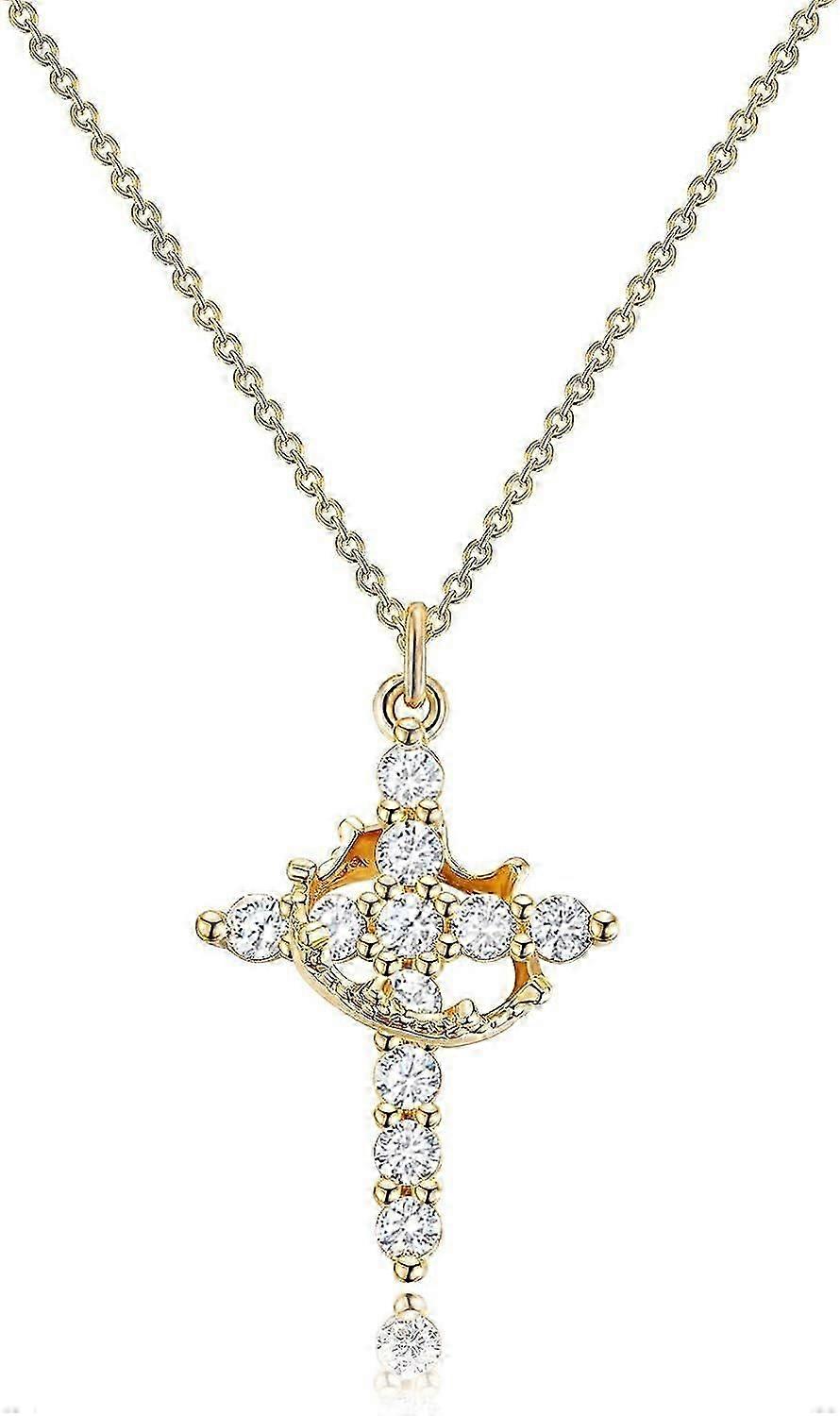 14K Gold Plated Crown Cross Necklace Diamond Accent_Lucky_B