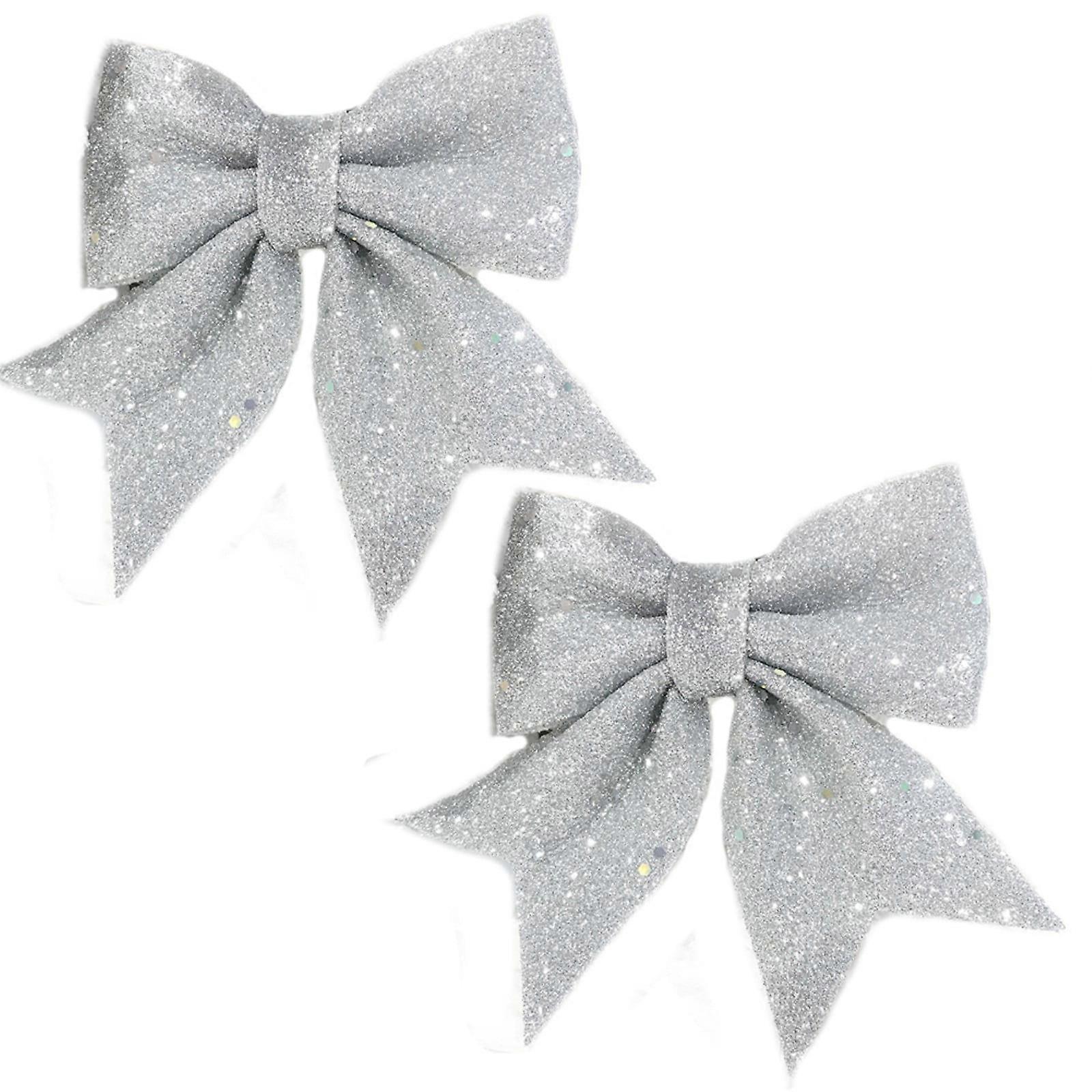 Seewan 2pcs Christmas Bow, Silver Wreaths Bows, Glitter Tree Bow with Sequins, Xmas Decorative Bows for Home, Party Decoration