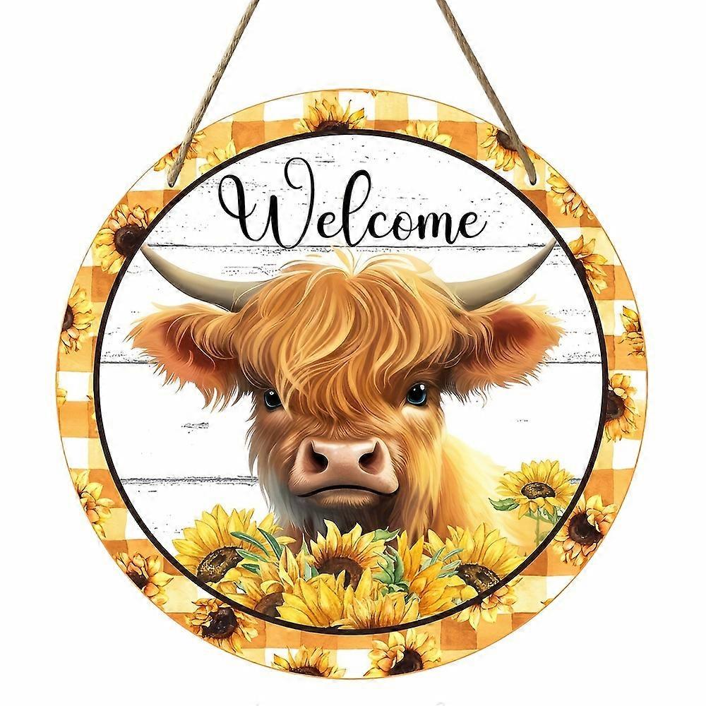 1pc Highland Cow Sunflower Welcome Sign, Rustic Farmhouse Door Hanger, Wreath Attachment, Round Wooden Wall Art Plaque for Home Decor