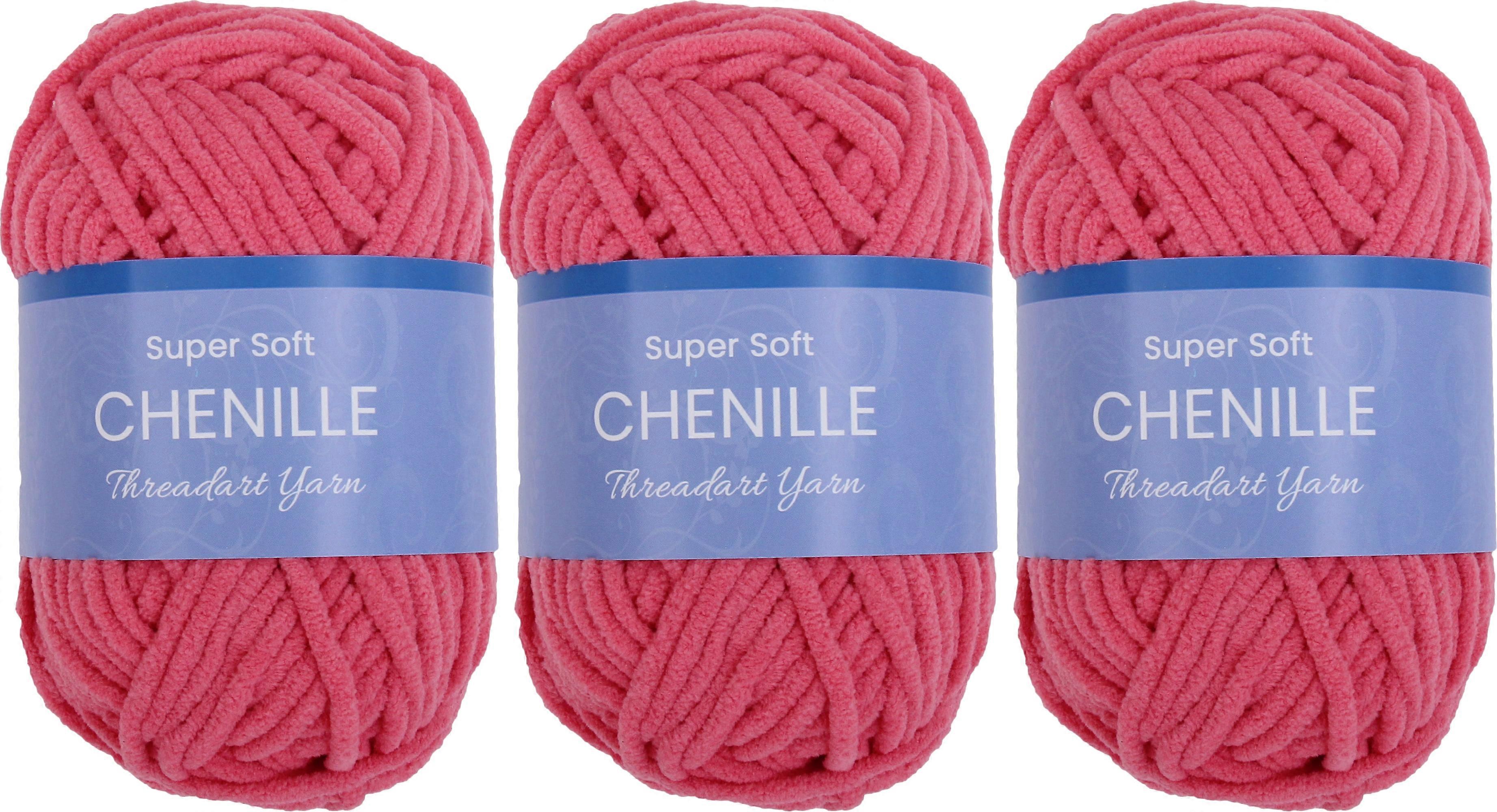 3 Pack ThreadArt Chenille Yarn for Crocheting, Knitting, Amigurumi, Super Soft Plush Velvet Yarn - 50 Gram 60 yds #5 Fluffy Yarn Skeins - Bright Pink