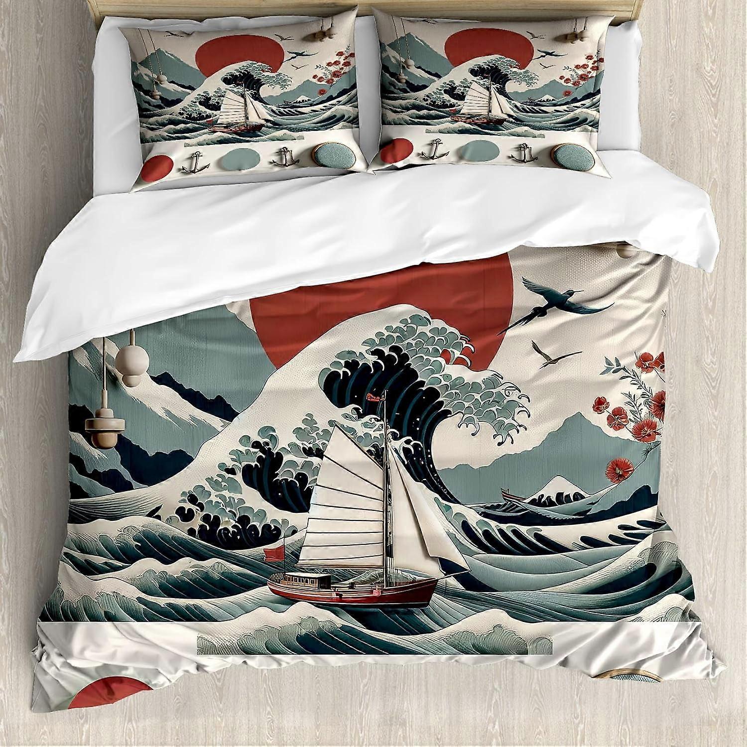 Nautical Duvet Cover Set, Japanese Wave with Sun Sakura Branches & Anchors, 3PC Bedding Set w/ 2 Pillowcases, Pale Ruby & Blue
