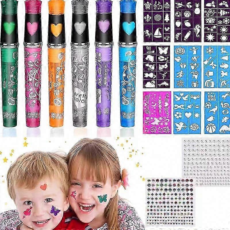 Glow-in-the-Dark Tattoo Pen Set - 6 Luminous Glitter Gel Pens with Stencils for Kids & Adults, Party & Festival Body Art