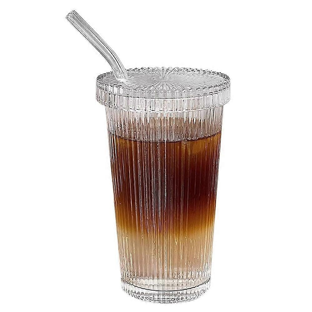 Drinking Glasses 13oz Glass Tumblers with Lids and Straws High Borosilicate Glass Cup Vintage Glassware for Iced Coffee Water Smoothie
