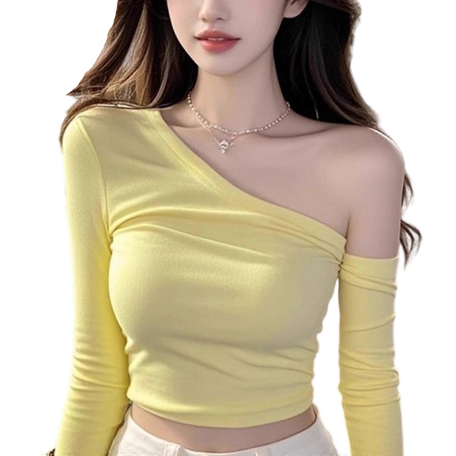 Women's Off The Shoulder Long Sleeve T-Shirt Stretchy Polyester Solid Color Slim Crop Top Blouse for Everyday Fashion Yellow XL