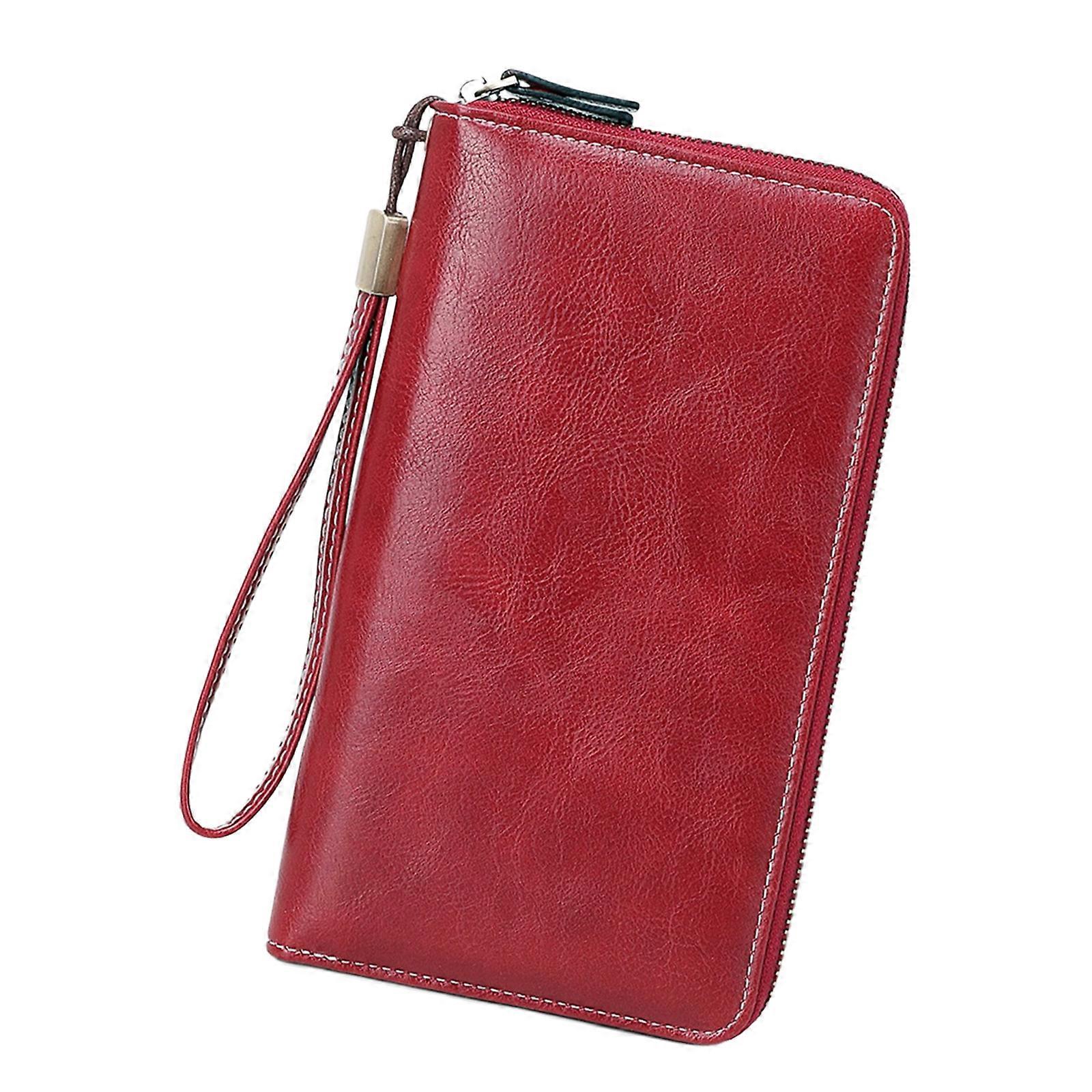 Women's Wallet Blocking PU Leather Zippers Around Wallet Large Capacity Long Purse Credit Card Holder with Wristlet Burgundy