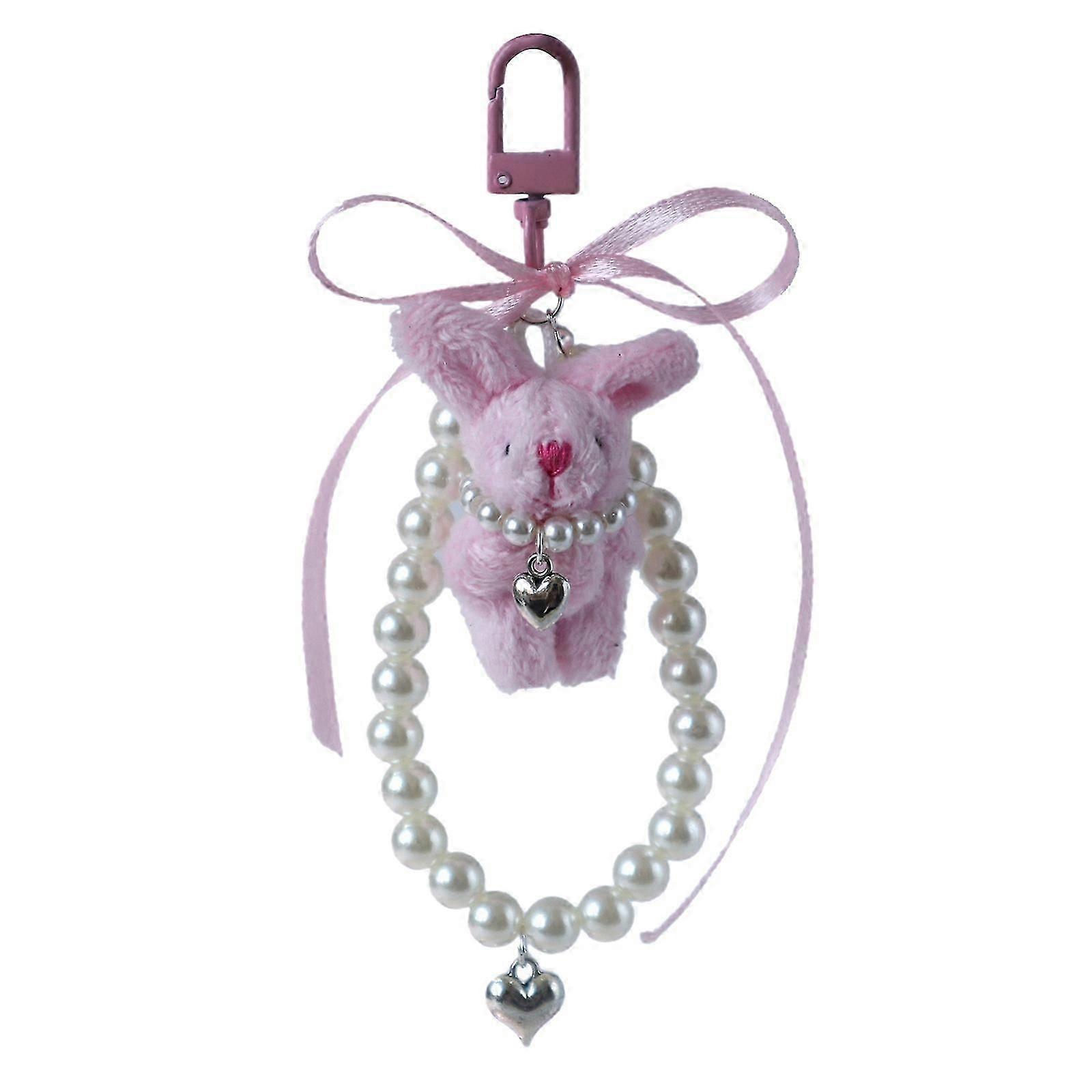 Cute Plush Rabbit Charm Keychain Sweet Heart Pearl Phone Chain Car Keyring Bag Pendant Backpack Decoration Women Jewelry White