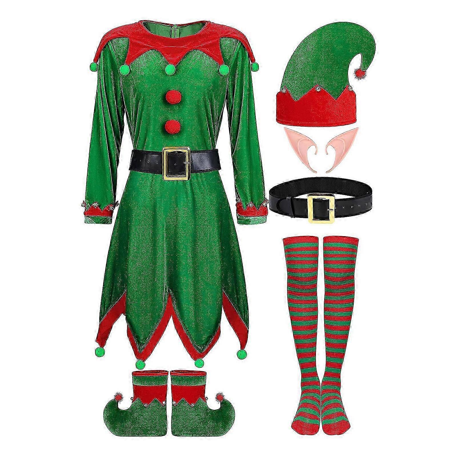 6Pcs Holiday Elf Costume Christmas Dress Hat Elf Ears Stripe Thigh High Socks Shoes Covers Christmas Costume Gifts 120 Features: Women christmas elf set,1piece christmas dress,1 pair striped over knee socks,1 pair christmas elf ears,1piece elf hat,1piece elf hat ,1 pair shoes,1 piece belt. Reliable material,make of polyester,comfortable and soft, warm and sturdy, not easy to break or fade, which can serve you for a long time and you can use them with confidence Occasion,which can be widely applied for theme costume parties, christmas, halloween, cosplay and so on, bringing a cheerful atmosphere to your home; and it is nice for taking photos, making you eye catching and charming Wonderful gift,sweet warm gift for friend family or yourself. There are different size optional. Specifications: Material:Polyester Size:100 Size:110 Size:120 Size:130 Size:140 Size:150 Size:160 Size:170 Size:180 Package Includes: 1 Set Christmas Elf Costume 1 Piece Dress 1 Pair Stripe Thigh High Socks 1 Piece Belt 1 Piece Elf Hat 1 Pair Boot 1 Pair Elf Ears note: Please allow 1-2cm errors due to manual measurement. Due to the difference betweeen different monitors,the picture may not reflect the actual color of the item.