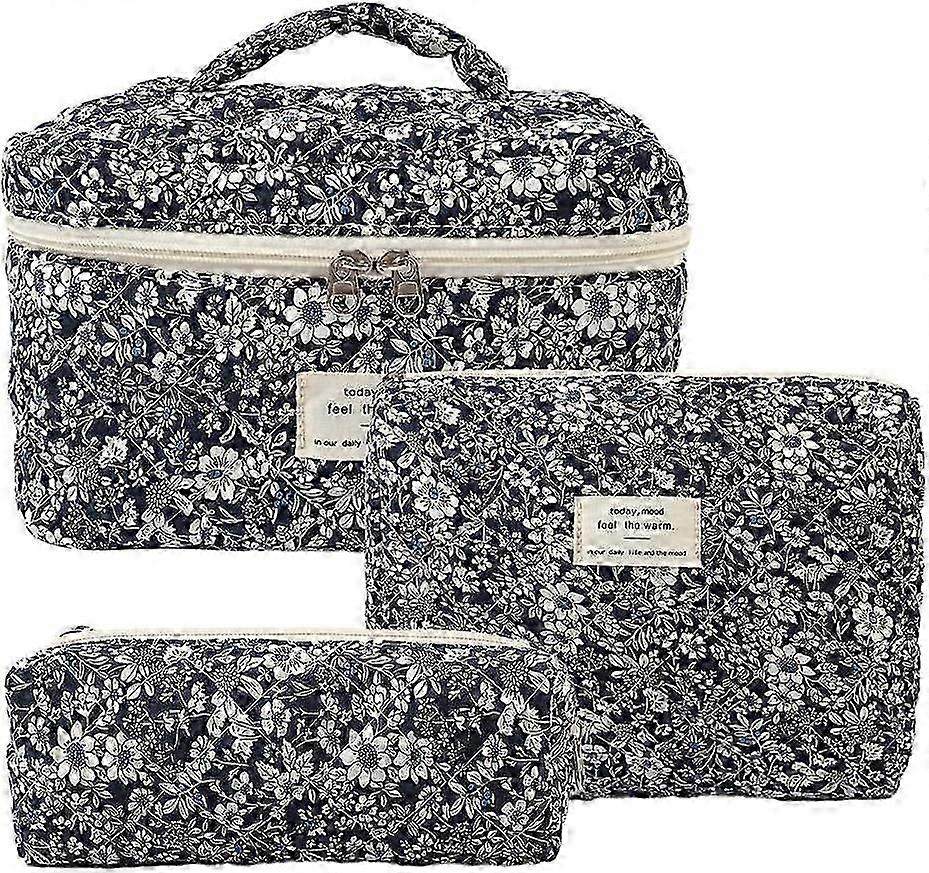 3Pcs Makeup Bag Cotton Quilted Travel Cosmetic Bag Cute Floral Makeup Pouch Large Toiletry Bag for Women Girls (Bow-Pink)q