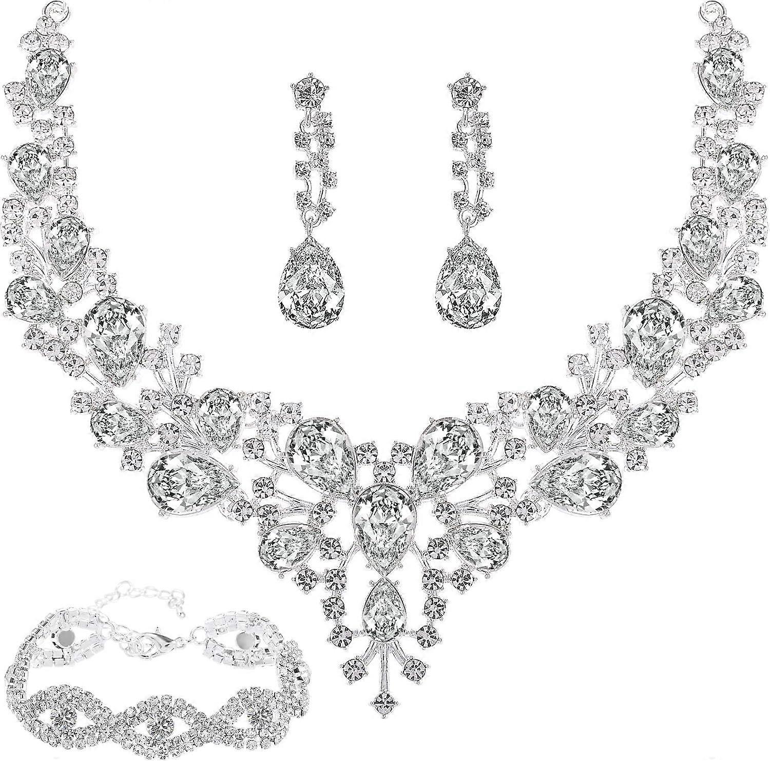 Yolev Bride Jewelry Set - Silver Crystal Rhinestone Wedding Necklace Bracelet Earrings for Bridesmaids Prom - Women and Girls