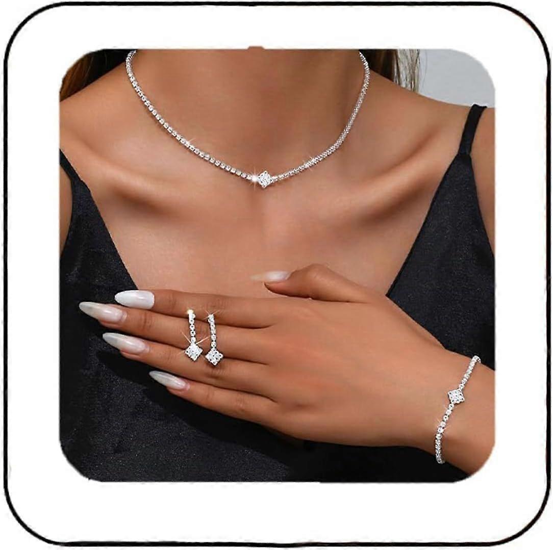 Silver Wedding Jewellery Set Sparkling Rhinestone Necklace Earrings and Bracelet Bridal Jewellery Set for Women Elegant Jewellery Set Silver Chain Rhinestone Bridal Jewellery Product description Elegant bridal jewellery set: this jewellery set includes a necklace, bracelet and earrings that add extra sparkle to your wedding look. Ideal for ladies looking for stylish accessories for special occasions 2. High-quality materials: made of shiny rhinestones and robust silver, the jewellery set for women offers a long-lasting quality. The timeless design of the rhinestone jewellery complements both classic and modern wedding styles 3. For a variety of occasions: the rhinestone necklace and bracelet set is not only suitable for weddings, but also for proms, engagement parties and festive evening events. A versatile jewellery set for elegant occasions. 4. Gift for bride and girlfriend: this jewellery set in silver is a wonderful gift for bridesmaids, the future bride or girlfriends who appreciate stylish pearl jewellery. Perfect for bridal showers and special occasions 5. Easy to wear: thanks to the lightweight design, the jewellery set for women is comfortable to wear without restricting freedom of movement. The rhinestone jewellery set remains comfortable even during long celebrations