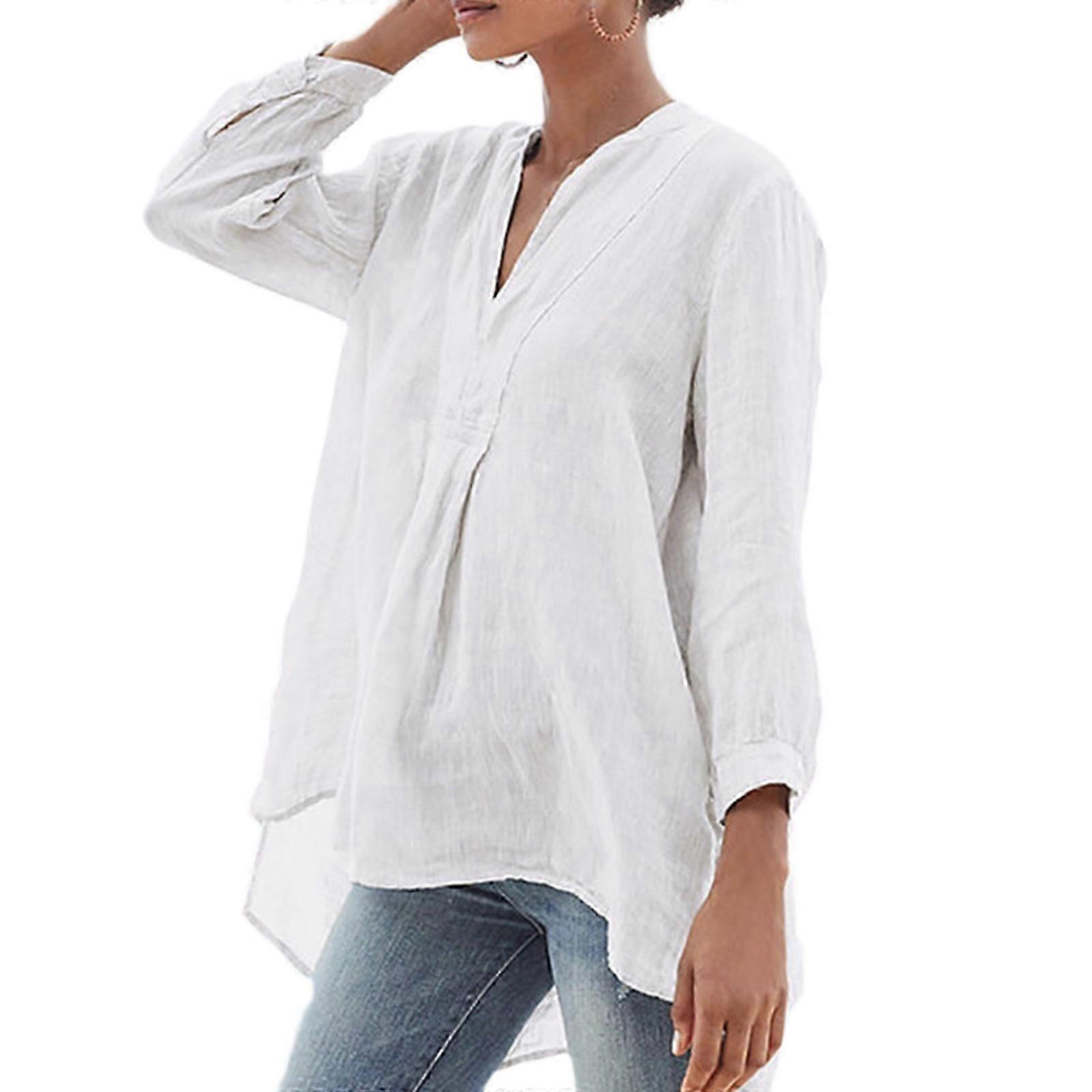 Women Casual 3/4 Puff Sleeve Solid Color Loose Tunic Shirt Pleats V-neck Linen Blouses High Low Hem Pullover Tops S-5xl White Xl