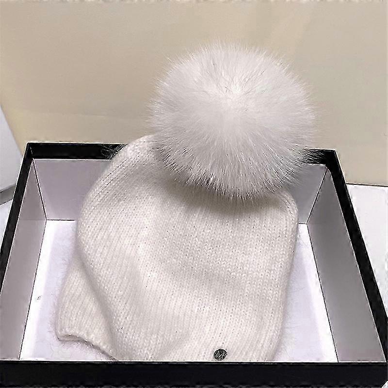 Knitted Ski Hat for Women - Fox Fur Pom Winter Beanie, Angol Soft Warm