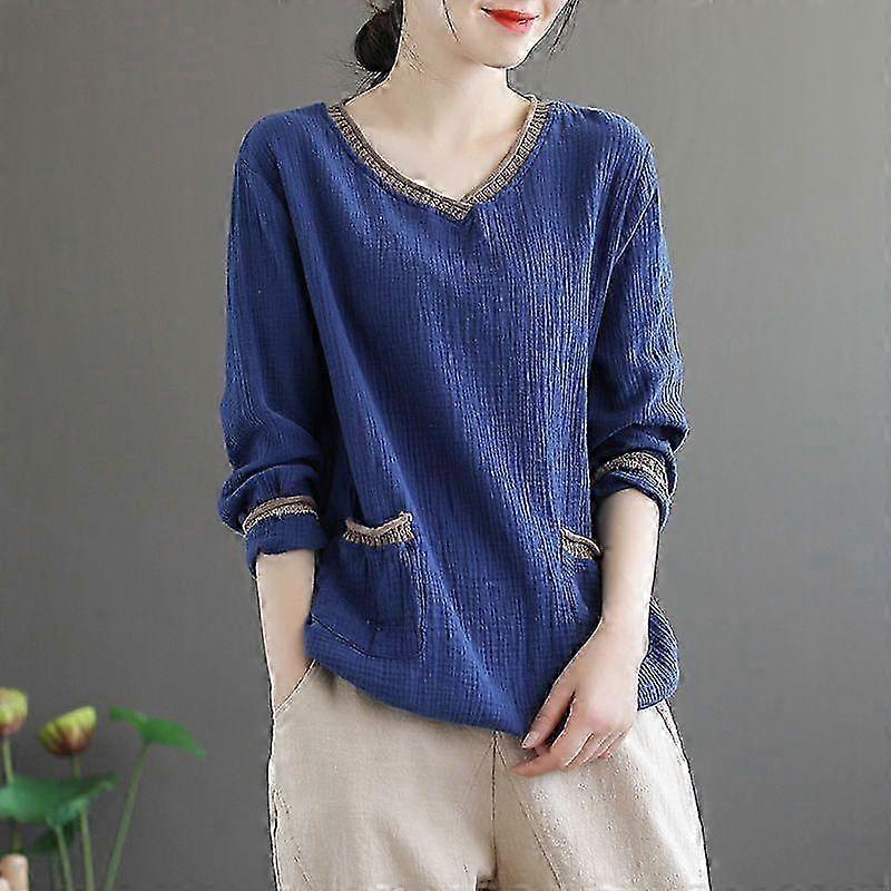 Oversized Floral Top for Women - Cotton Linen Vintage T-Shirt Long Sleeve