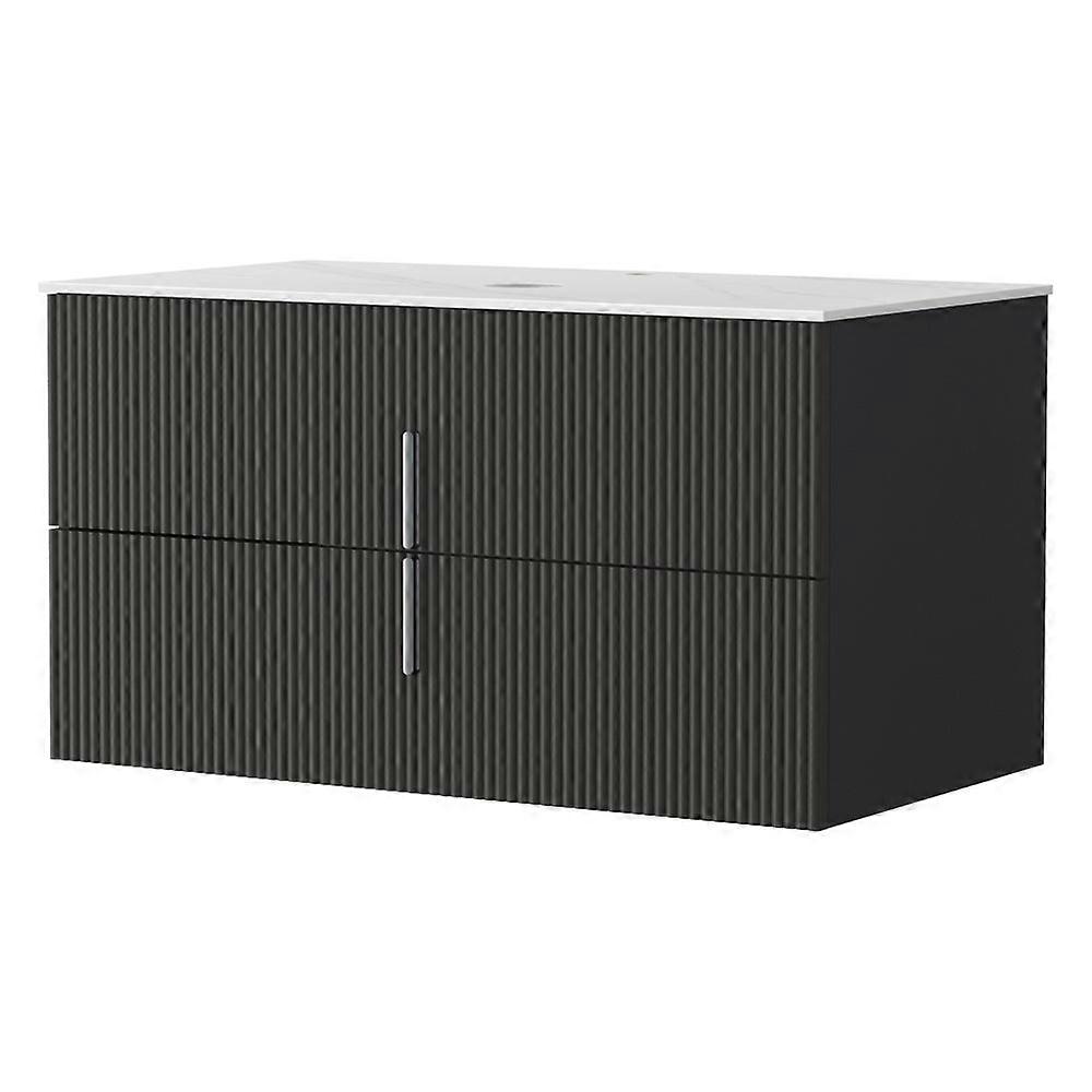 Modern Contemporary Design With Matte Black Soft-Flute Timber Front Wall-Hung Cabinet To Save Floor Space And Create An Airy Feel Eco-Friendly E1 Mdf Material With Moisture-Resistant Properties Durable 15Mm Mdf Board Construction Elegant Carrara White Sintered Stone Countertop Resistant To Stains And Scratches Two Deep 82Cm-Wide Drawers With Brushed Alloy Handles And Soft-Closing Runners Pre-Cut Basin And Tap Holes For Easy Installation (Basin Sold Separately) Full Back Panel For Added Support And Protection Easy To Clean And Maintain Specifications