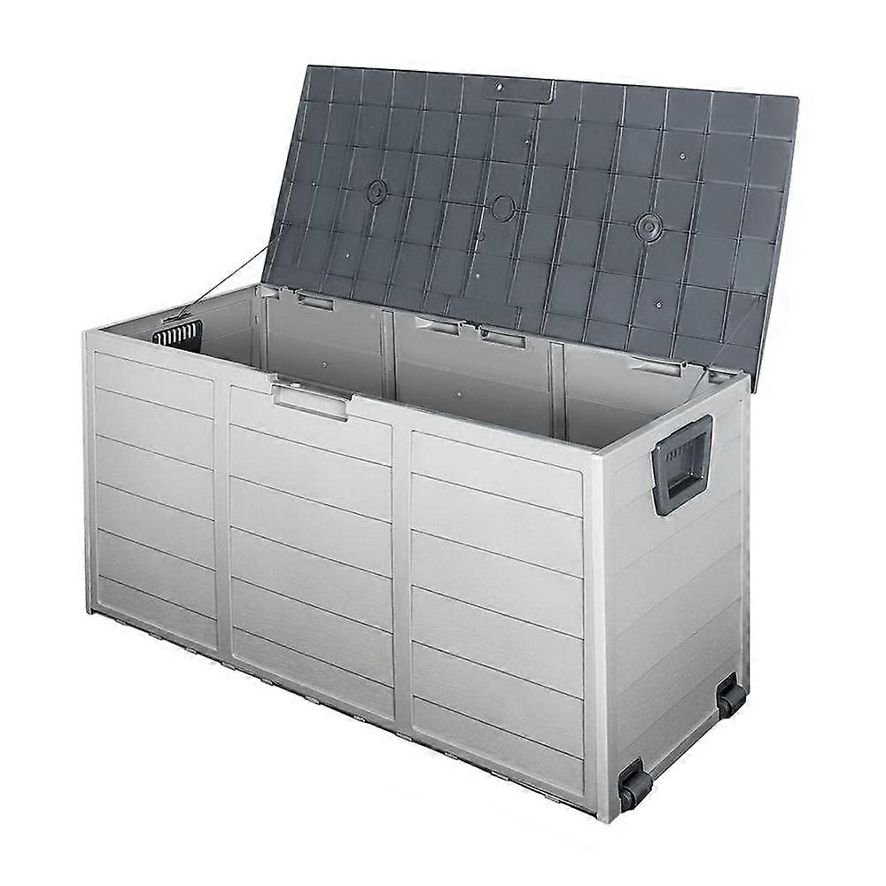 Generous 290L Storage Capacity Weather-Resistant Material For Long-Lasting Durability Lid Support Brace For Controlled Opening And Closing Lockable Lid (Lock Not Included) Inner Lid Stopper For Added Safety Equipped With Wheels For Easy Mobility Side Handles For Convenient Carrying Easy To Assemble Without Tools Specifications: