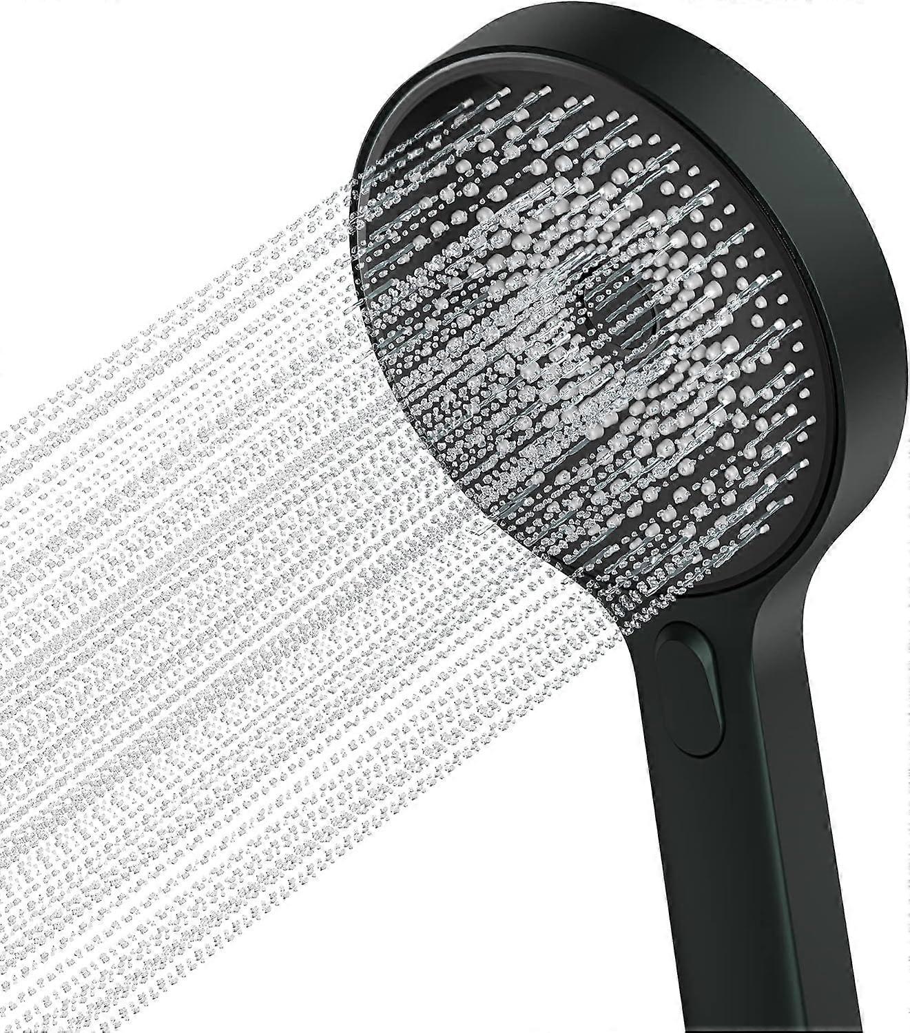 [Large-Sided Shower Head] The diameter of the pressure shower head is 5”/130 mm, which improves the coverage area so that you can enjoy the shower experience. It is an ideal choice for fast and thoroughly rinse shampoos.[6 Spray Mode Shower head] The 5 in diameter handheld shower head includes 6 spray modes: oxygenated shower spray, rain, rain+massage, massage, massage+power wash, power wash. After a tiring day, you can choose the massage mode to let you relax with a hot shower. Easily changed the modes by the button.[High Pressure Shower Head] This handheld shower head uses a unique pressurization technology to greatly increase water pressure, providing a full-coverage shower experience even at low water pressure. Let you fully enjoy the pleasure of showering. Equipped with water-saving gasket for people who need it, effectively controlling the flow rate not to exceed 1.75 gallons per minute.[Premium Material] The handheld shower head is made of advanced ABS eco-friendly material. It feels skin-friendly and effectively insulates against heat, while ensuring hardness and durability. New upgraded electroplated black outer layer with multi-layer baking paint process has adhesion and can resist corrosion, even after long time use, the layer is always bright as new and will not come off.[Easy to install and clean] No tools are required. This handheld shower head is a G1/2 interface, which is suitable for most shower connectors. The shower head with anti-silicone nozzles has good elasticity and abrasion resistance. Therefore, you can easily scrape the residue with cloth.