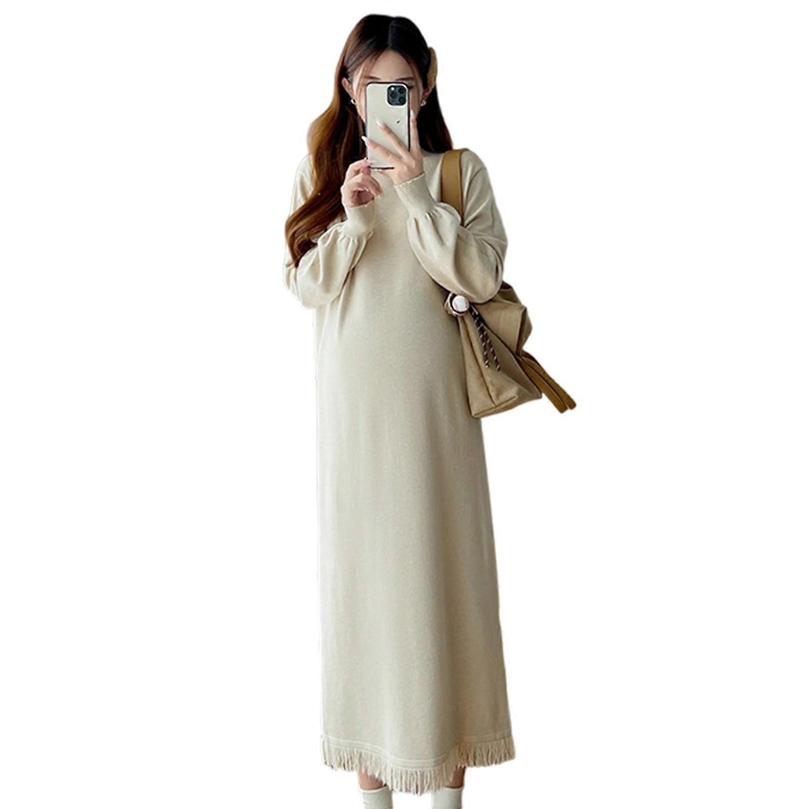 Stylish Pregnancy Knitted Dress with Fringe Detail for Autumn Winter Fashionable Warm Acrylic Comfortable Fit oat XL