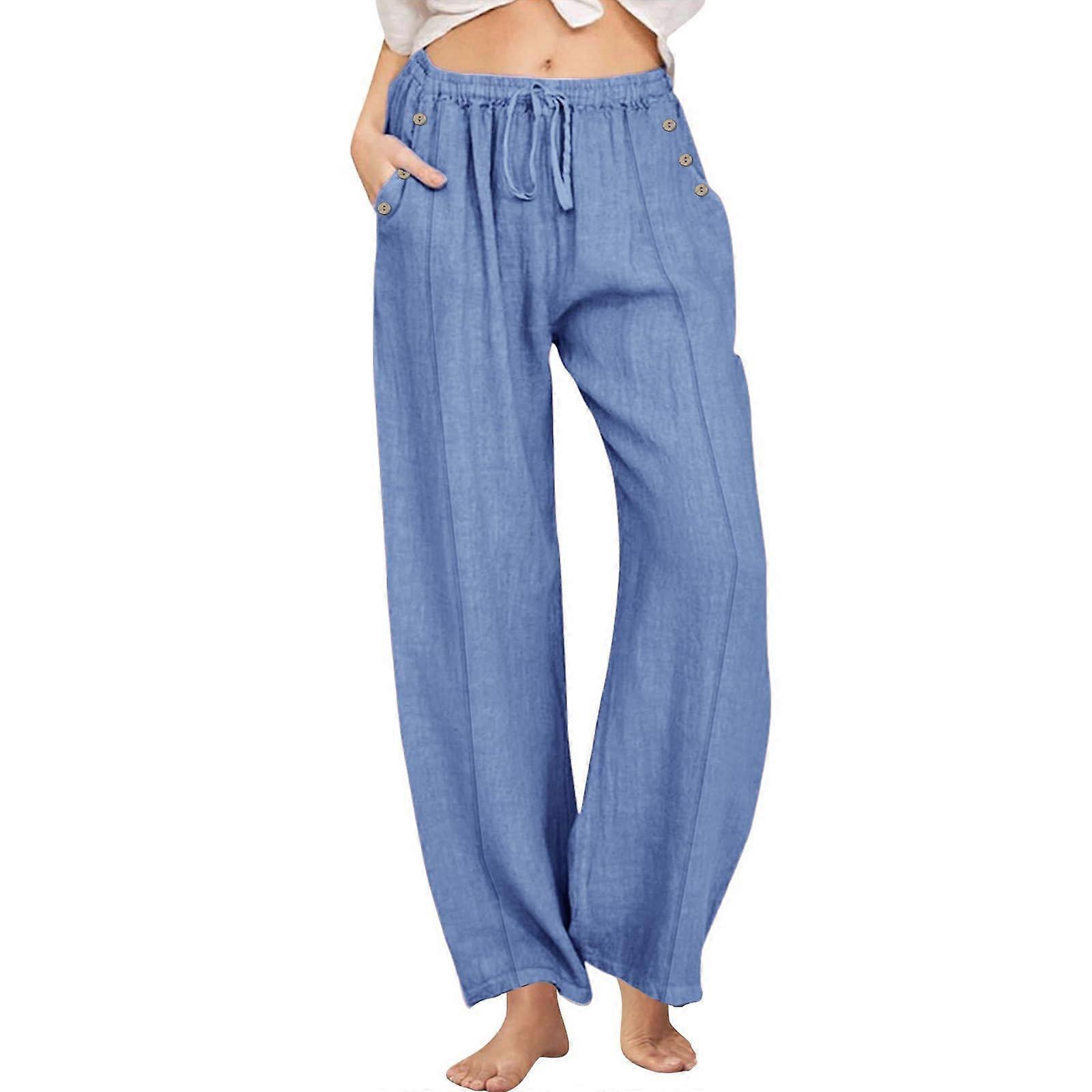 Women's Linen Beach Casual Wide-Leg Pants with Drawstring Pockets Sky Blue XL