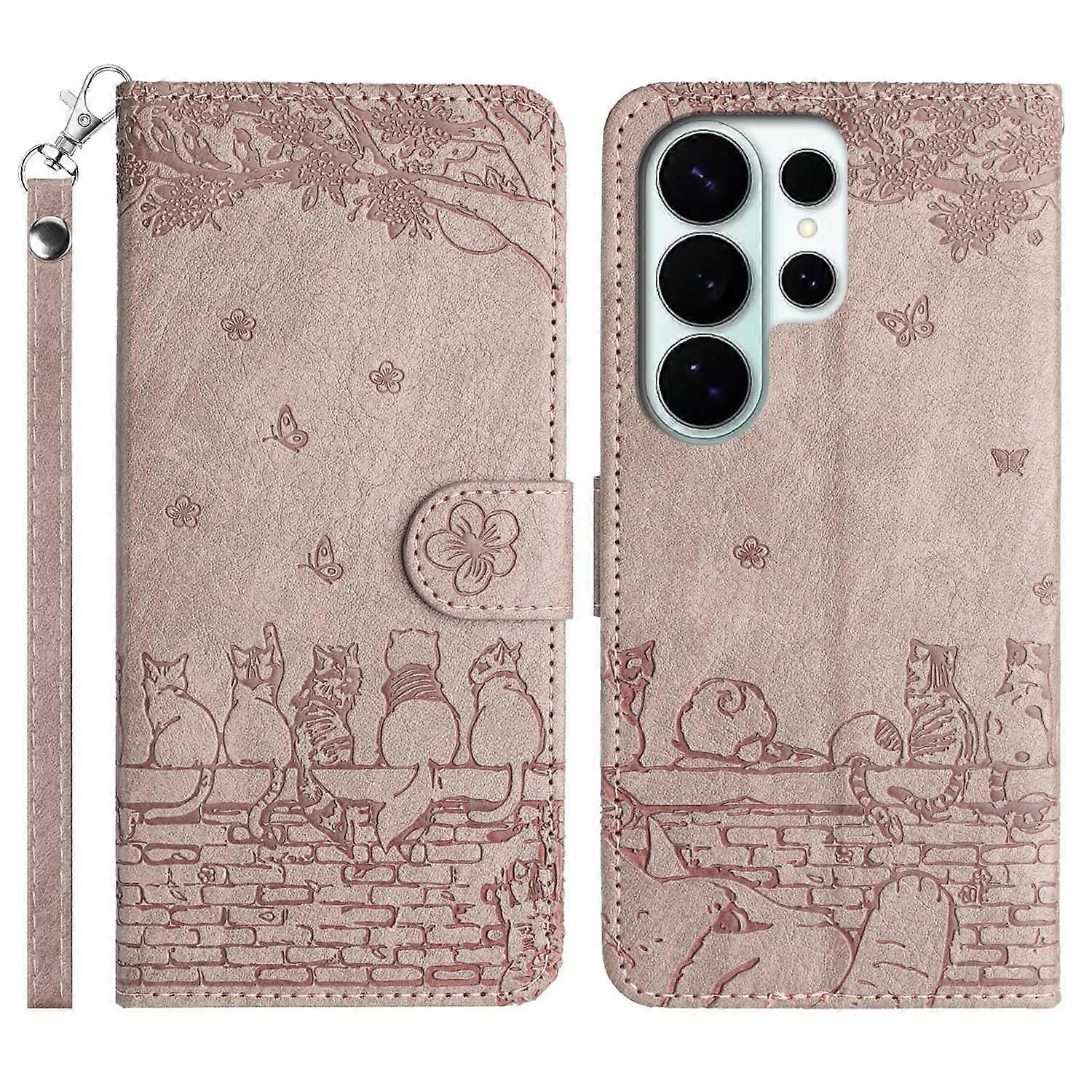 For Samsung Galaxy S26 Ultra Case with Wrist Strap Leather Phone Cover Wall Cats Pattern