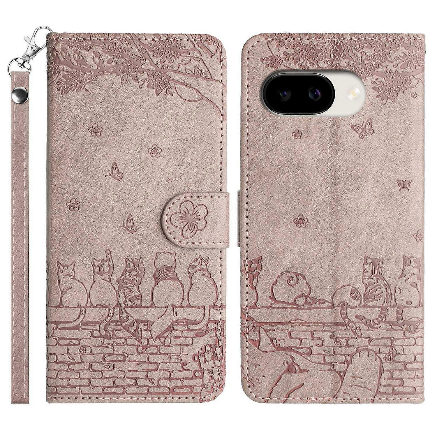 For Google Pixel 10a Case with Wrist Strap Leather Phone Cover Wall Cats Pattern