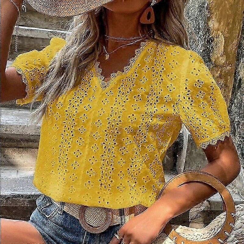 Vintage Lace Hollow Solid Shirt Women 2022 Summer Elegant Fashion V-neck Lady Tops Puff Sleeve Pullover White Blouse Femme 21385 Label: Yes Name:Magesuek Style:vintage Origin:CN(Origin) Fabric Type:Broadcloth Material:Polyester Material:Cotton Thickness:Thin Clothing Length:Short Decoration:Folds Shirts Type:Blouses Dress Patterns:Pullover Collar:V-Neck Sleeve Style:Puff Sleeve Season:Summer Material Composition:Synthetic fiber Pattern Type:Solid Sleeve Length(cm):Short Combination Form:Single-piece Set Gender:WOMEN Age:Ages 18-35 Years Old Release Date:Summer 2022 Clothing Patterns:LOOSE Size:S M L XL 2XL 3XL style:Fashion Color classification:White, black, yellow, purple, green, rose, orange. Sleeve shape:Puff sleeves Component content:71%-80% Year season:Summer 2022 Sleeve length:Short sleeve S:Length:62CM;Bust:94CM M:Length:63CM;Bust:98CM L:Length:64CM;Bust:102CM XL:Length:65CM;Bust:106CM 2XL:Length:66CM;Bust:110CM 3XL:Length:67CM;Bust:114CM