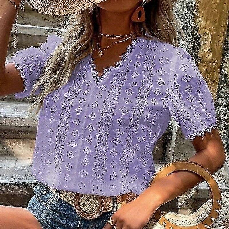 Women's Fashion Pullover for Summer with Puff Sleeves and Hollow Lace Pattern