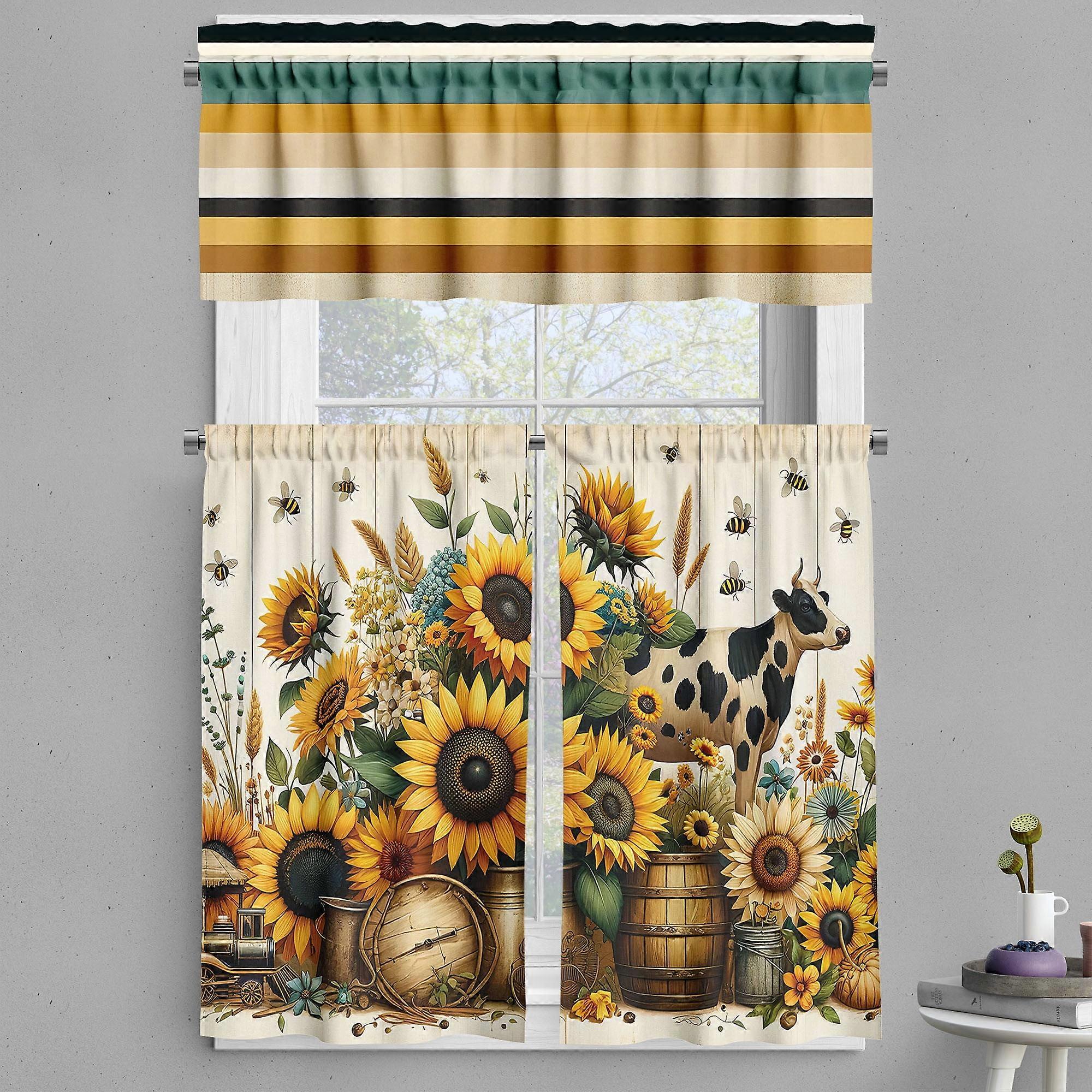 Ambesonne Farmhouse Valance & Curtain 3 Pcs Set, Sunflowers Cow Bee Summer, 55"x24", Mustard Eggshell Cocoa