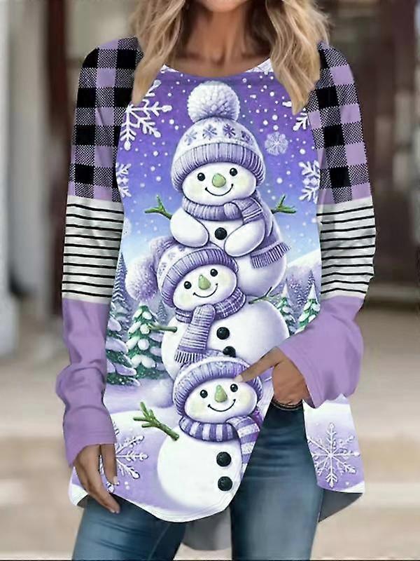 Women's Plus Size Long Sleeve Christmas Cartoon Snowman Print Round Neck Knit Top, Elastic Fashion Holiday Tee for Fall & Winter