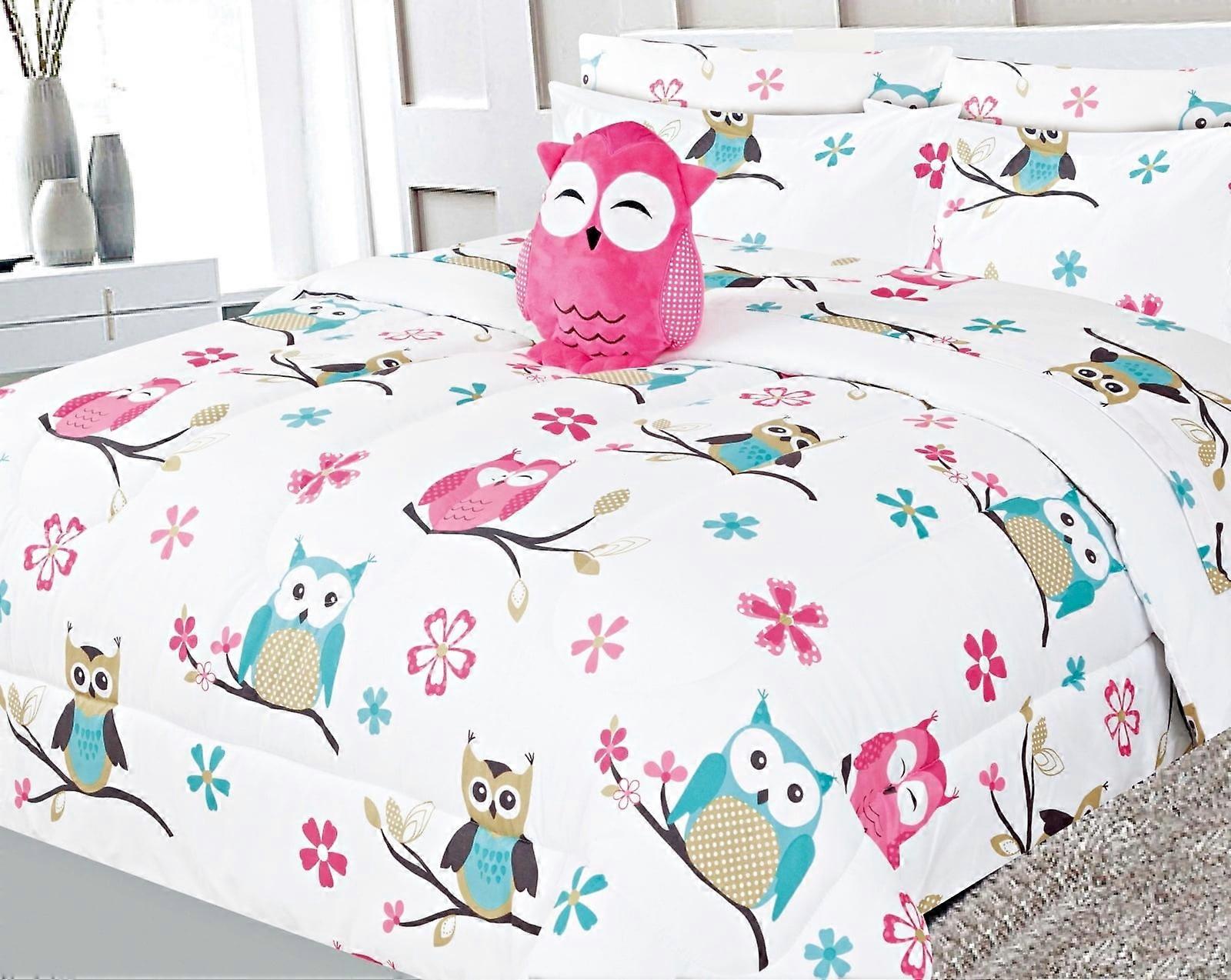 Comforter set matching fitted sheet set and pillow sham plushie toy twin size owl #3 white bag print design supersoft for girls, boys bedroom décor