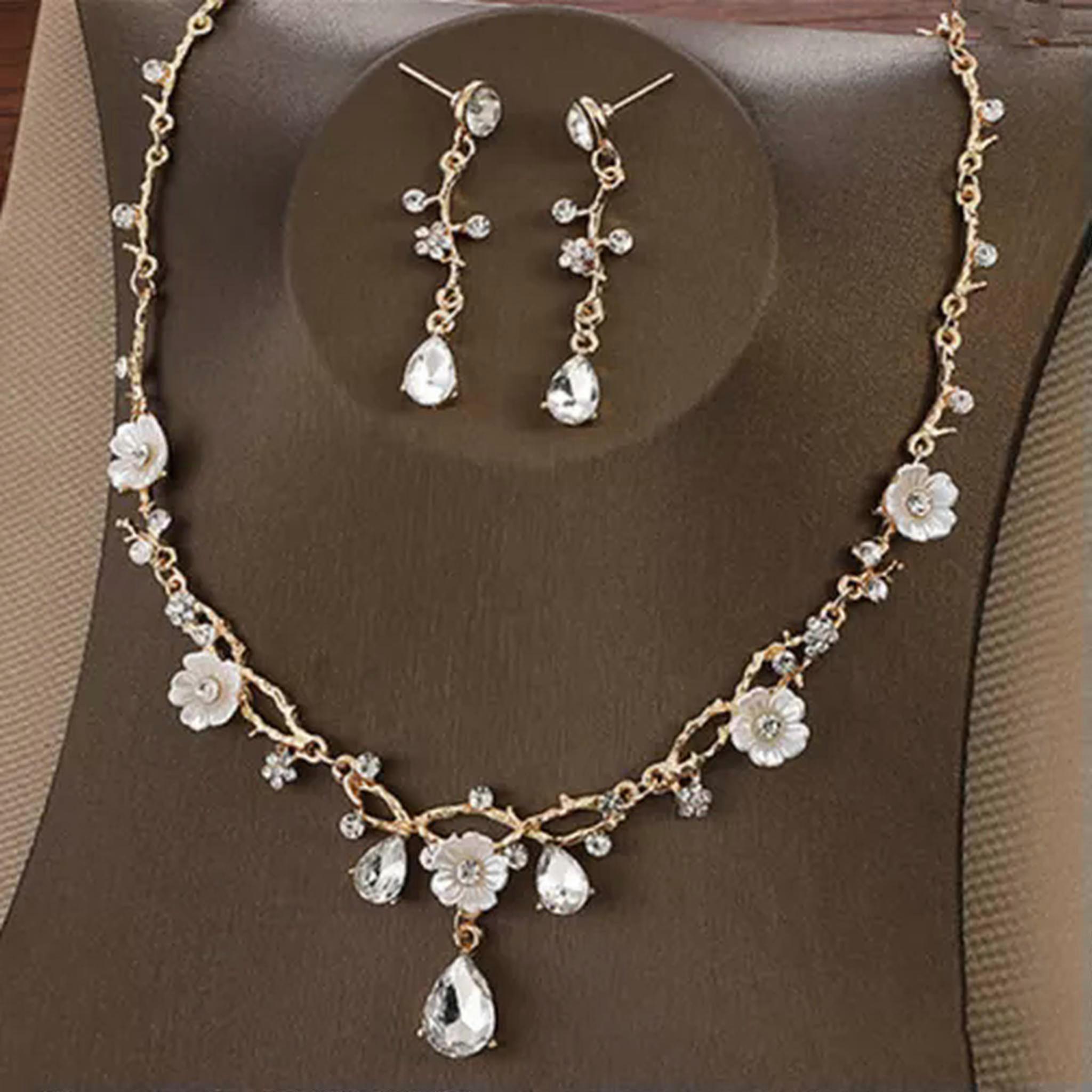 RSAMD Flower Crystal Costume Creative Jewelry Rhinestone Necklace Earrings Set Jewelry-Gold Welcome to our jewelry emporium that's brimming with dazzling options for every style seeker. For the lovely ladies, we have an array of enchanting pieces. From the dainty necklaces that delicately adorn your collarbone to the elaborate rings that make a bold statement. There are bracelets that add a touch of grace and earrings that enhance your beauty. But don't think we've forgotten about the gentlemen! We have a selection of masculine and stylish accessories too. Sturdy rings for a touch of rugged charm, sleek bracelets that exude sophistication, and understated necklaces that add a hint of refinement. Our collection combines timeless classics with modern trends, crafted with precision and using top-quality materials. Whether you're looking for a piece to wear on a daily basis or for a special event, we've got you covered. So, step into our world of jewelry and discover that perfect piece that reflects your individuality, no matter your gender! Suitable for Gifting Fit for Every Occasion 100% New and of High Quality Crafted from Professional-Quality Materials Easy to Pair and Wearable at All Times and Places